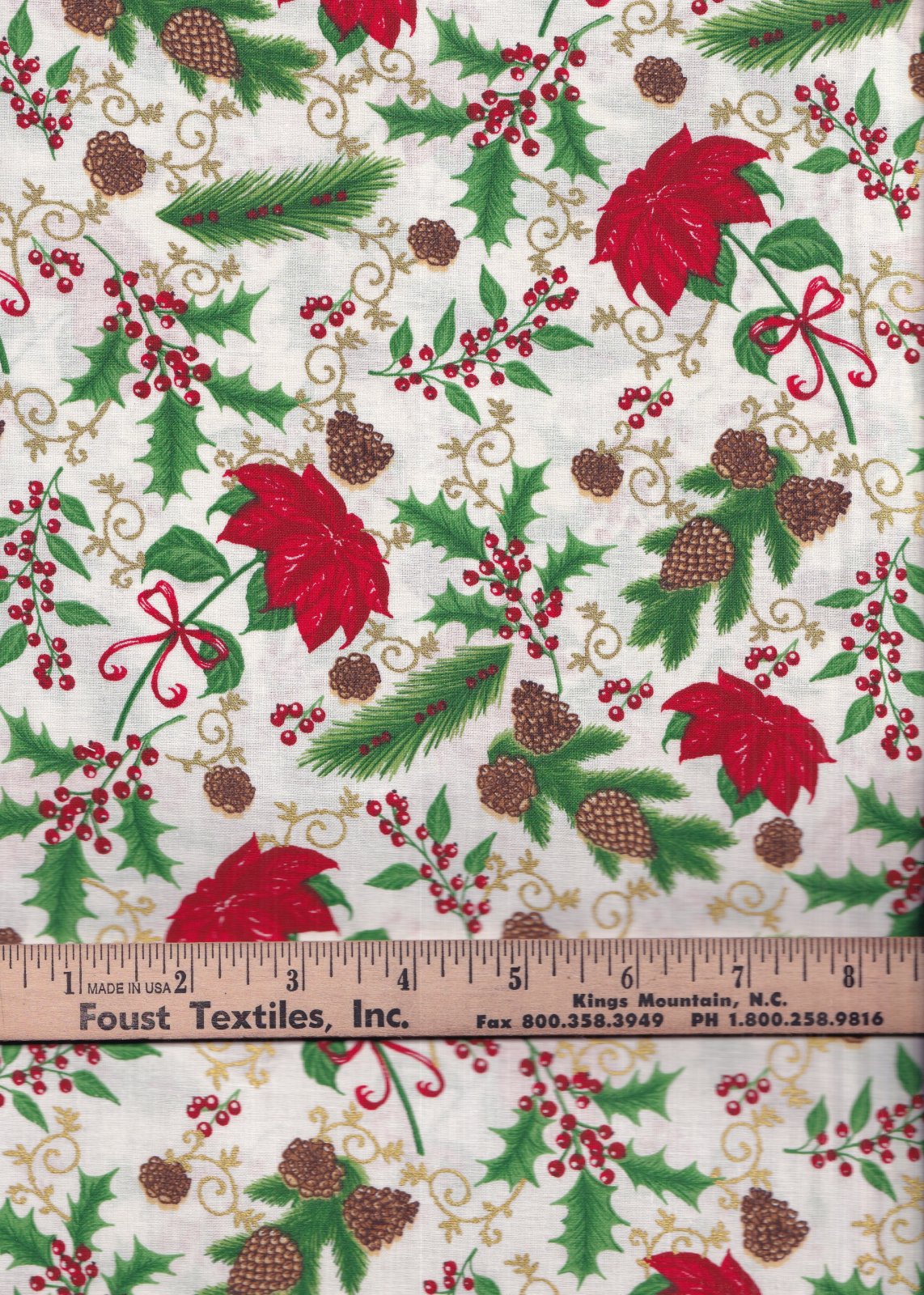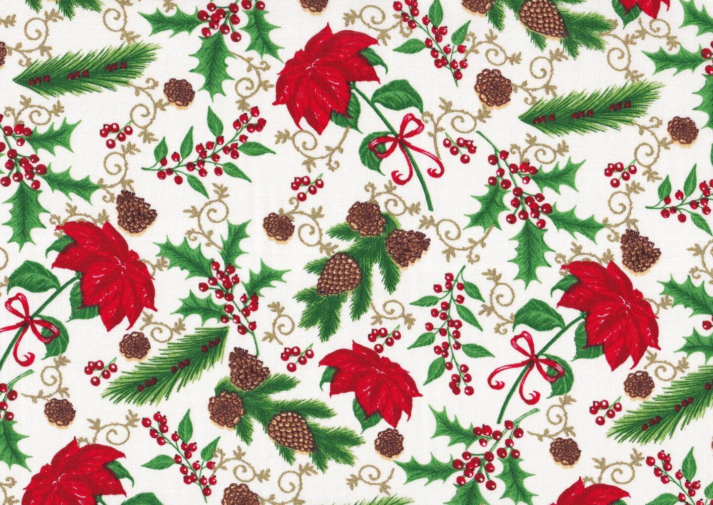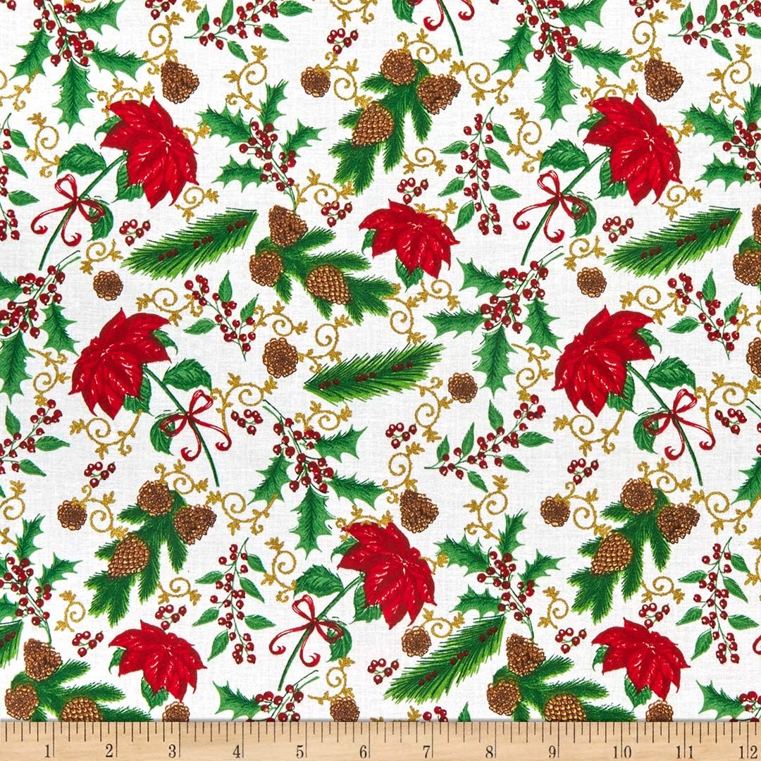 Foust Textiles Tis the Season Poinsettias and Pinecones Ivory Gold Metallic 100% Cotton Price per Yard