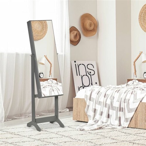 Freestanding Grey Jewelry Armoire with Full-Length Mirror and Lockable Cabinet 100 Earring Slots