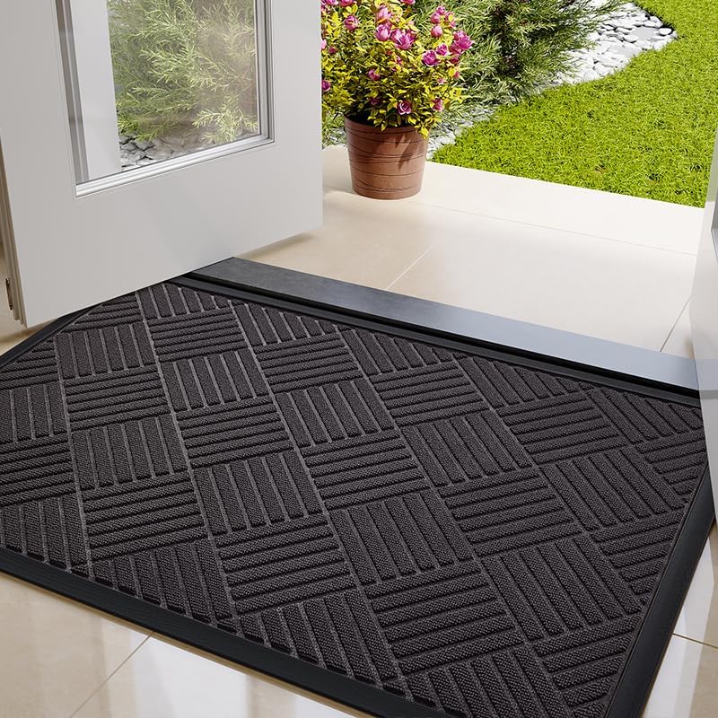 Front Door Mat Outside Entrance, Indoor Outdoor Low Profile Rubber Doormat, Waterproof Heavy Duty Patio Mat, Fade Resistant, Easy Clean All-Weather Durable, Small 17x29.5 inch Grey Striped