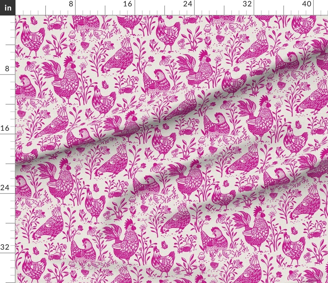 Fuschia Bright Rooster Chickens Toile De Jouy Farmhouse Cottage Chicks Scandinavian Custom Printed Fabric by Spoonflower Various Fabrics by the Yard or Fat Quarter