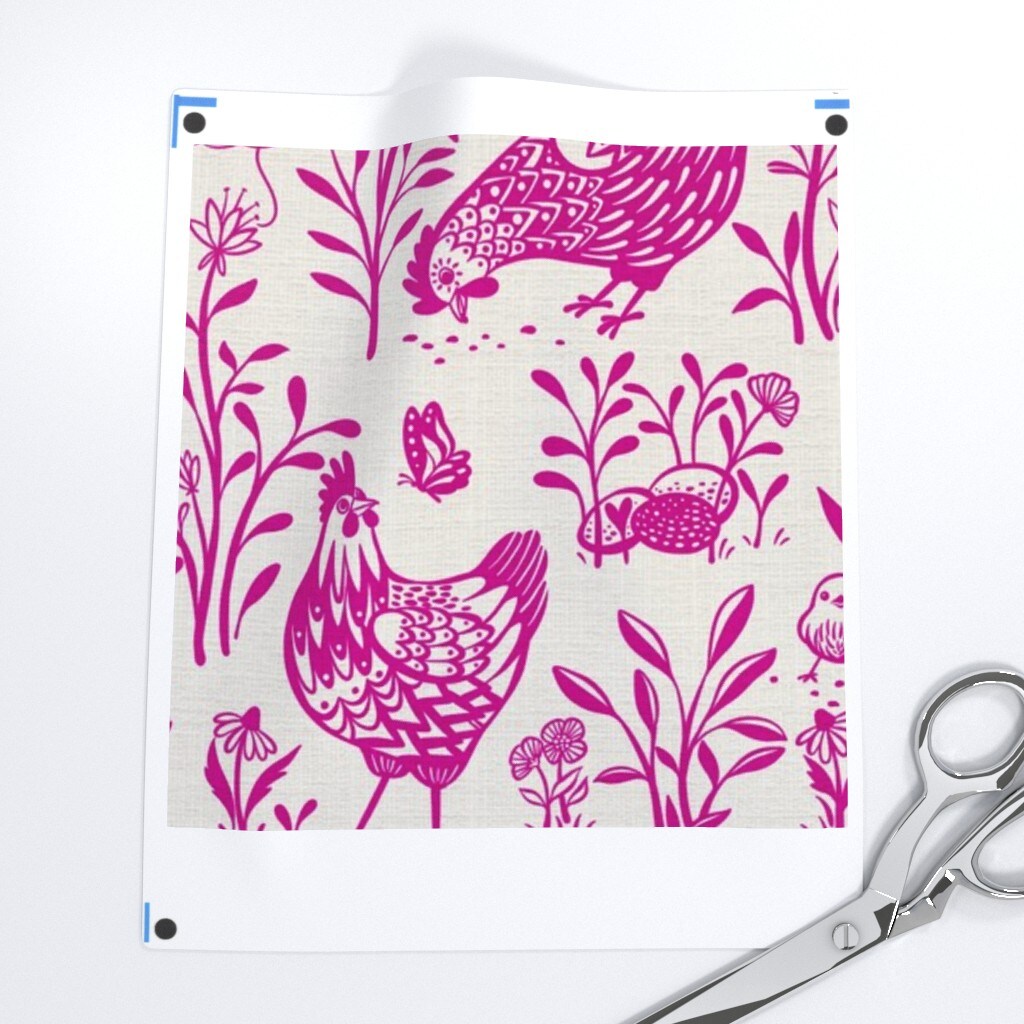Fuschia Bright Rooster Chickens Toile De Jouy Farmhouse Cottage Chicks Scandinavian Custom Printed Fabric by Spoonflower Various Fabrics by the Yard or Fat Quarter