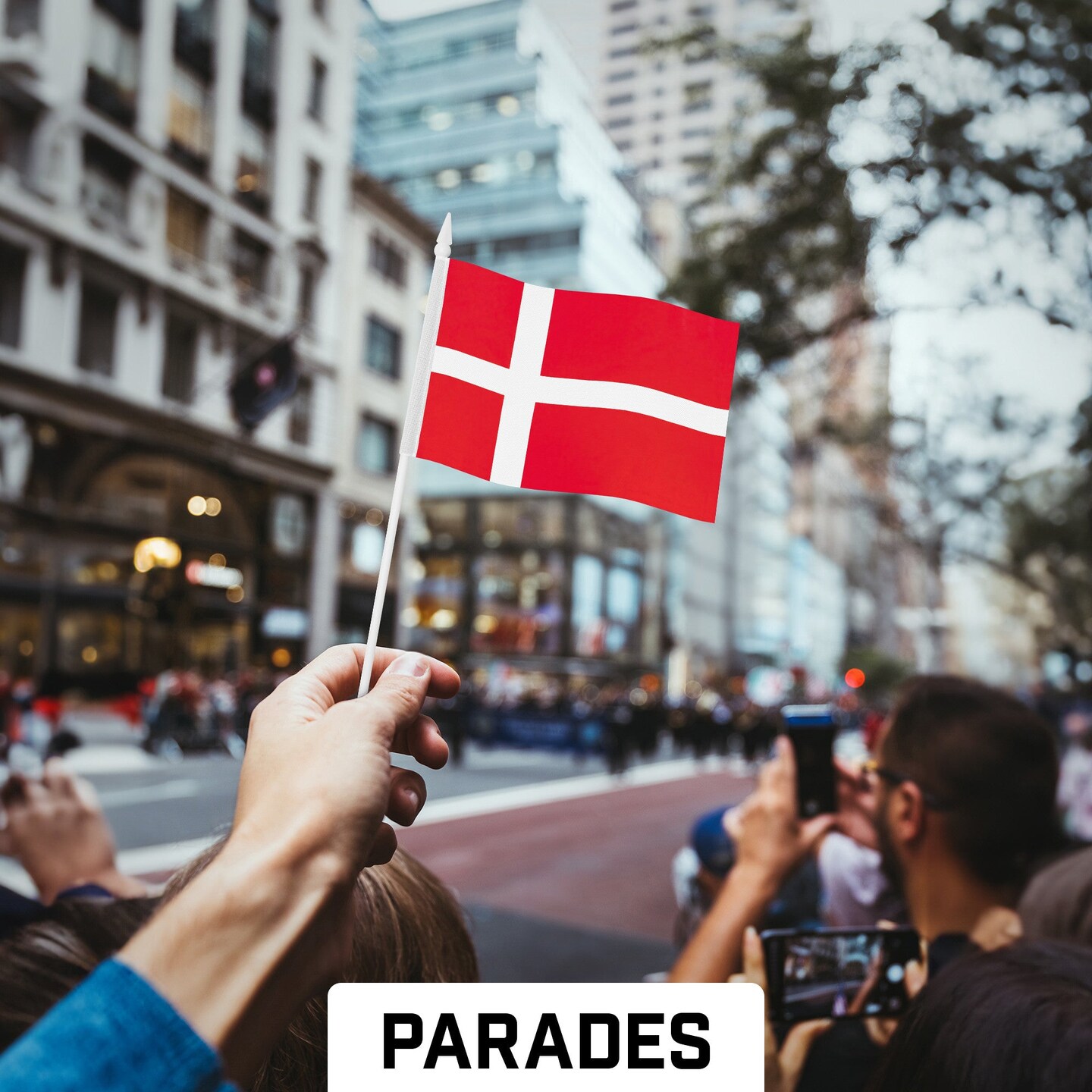 G128 24 Pack Handheld Denmark Danish Stick Flags | 4x6 In | Printed 150D Polyester, Country Flag, Solid Plastic Stick, Spear White Tip