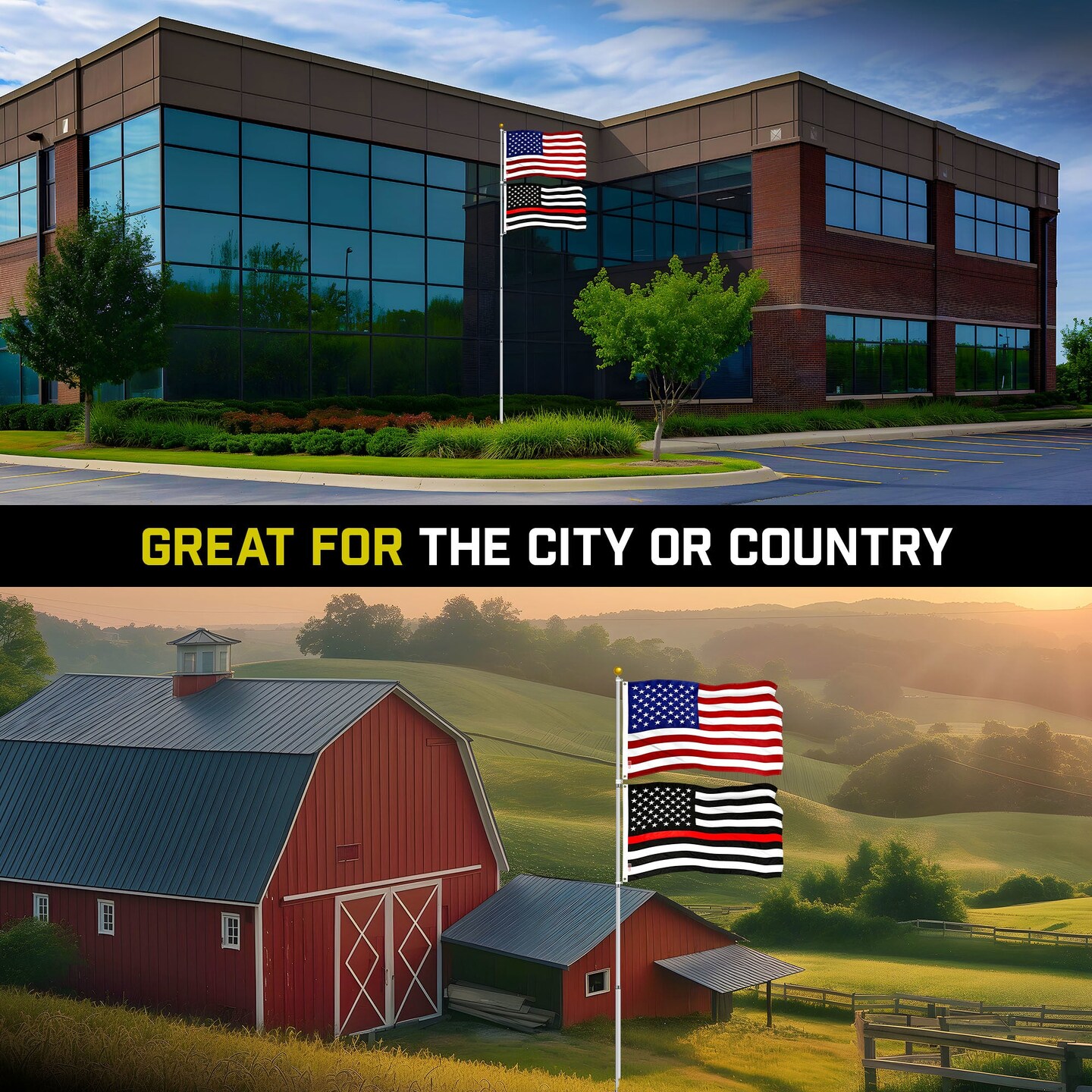 G128 Combo Pack: 25 Ft Telescoping Aluminum Flagpole (Silver) & American and Thin Red Line Flags 3x5 Ft, Both ToughWeave Series Embroidered Polyester | Pole with Flags Included