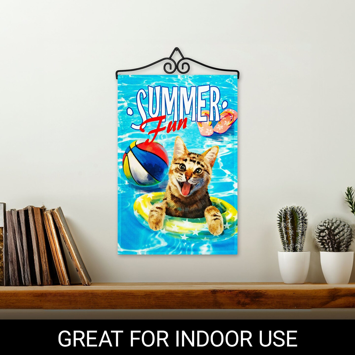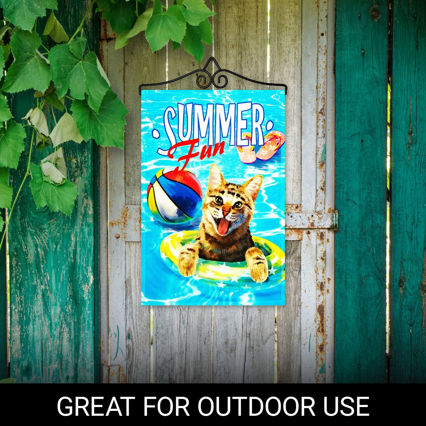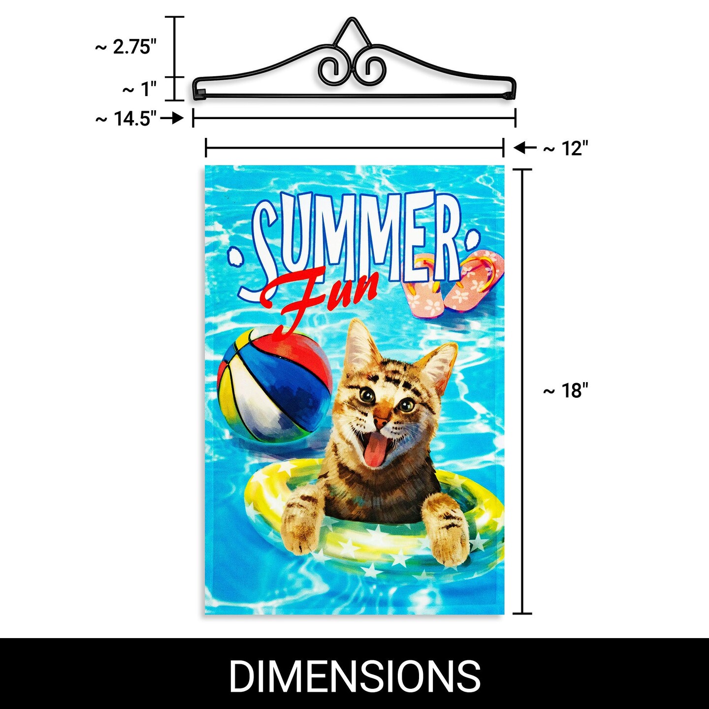 G128 Combo Pack Garden Flag Hanger 14IN & Garden Flag Summer Fun with Cat in Pool 12x18IN Printed 150D Polyester