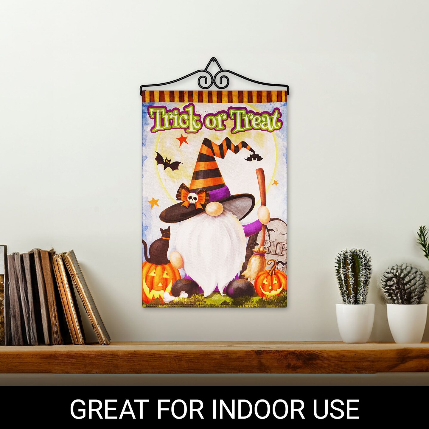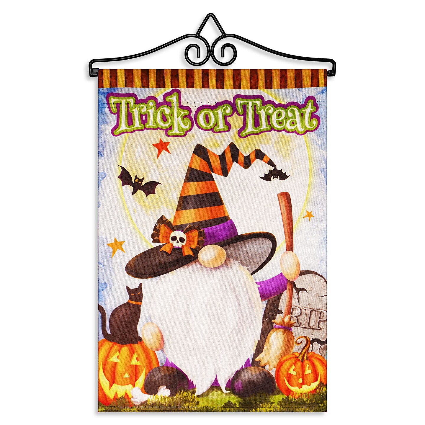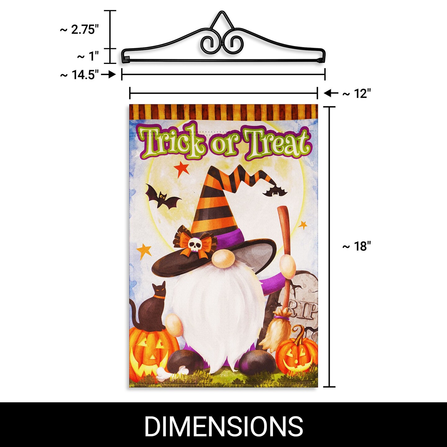 G128 Combo Pack Garden Flag Hanger 14IN & Garden Flag Trick or Treat Witch Hat Gnome with Broom 12x18IN Printed Double Sided Blockout Fabric
