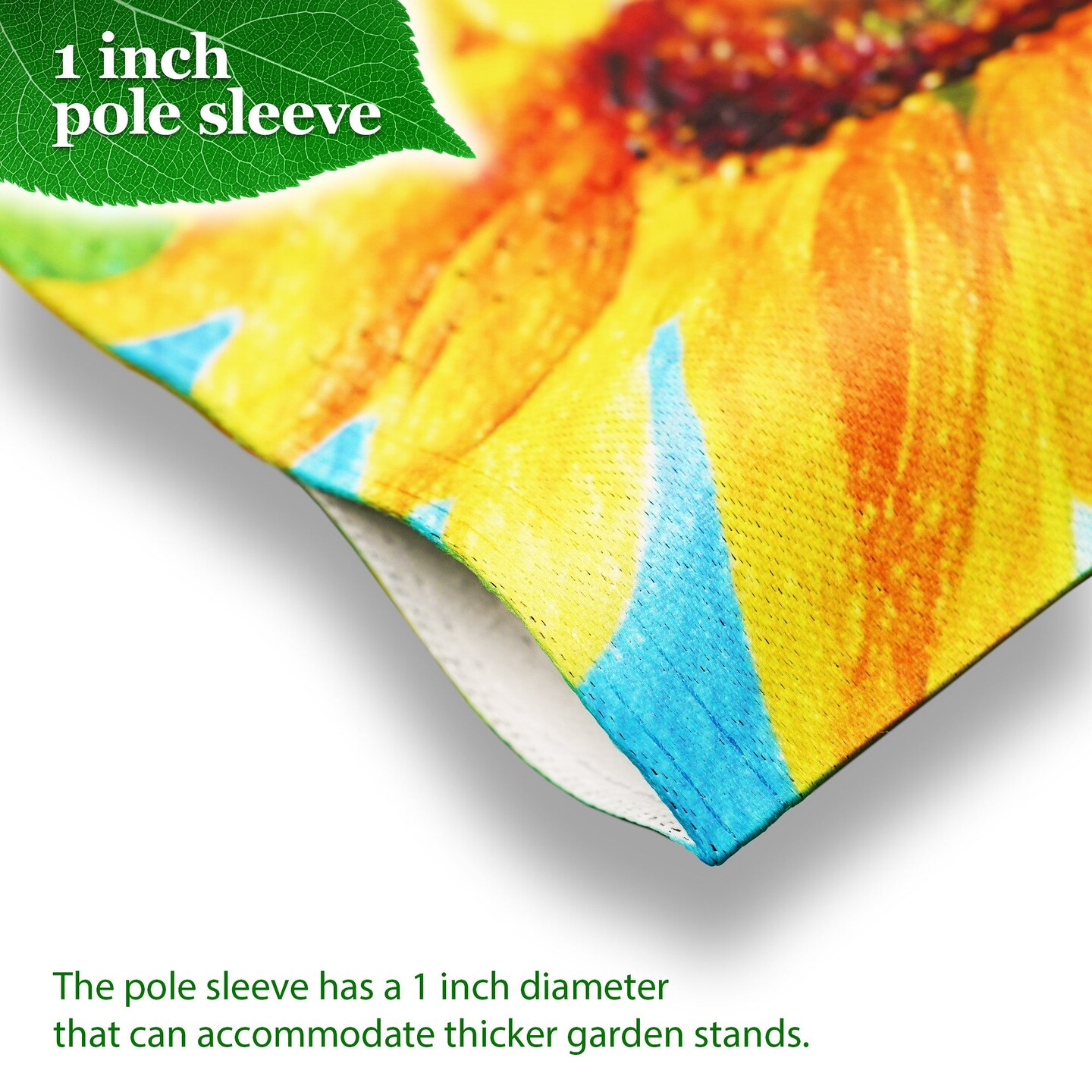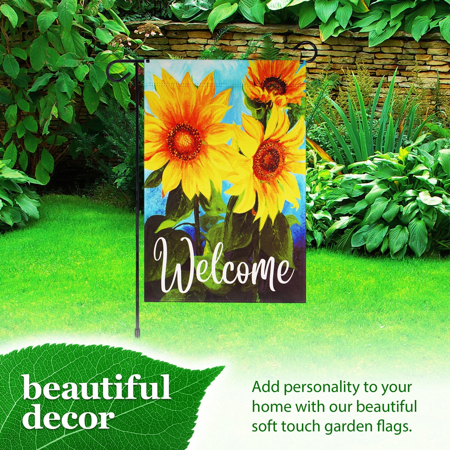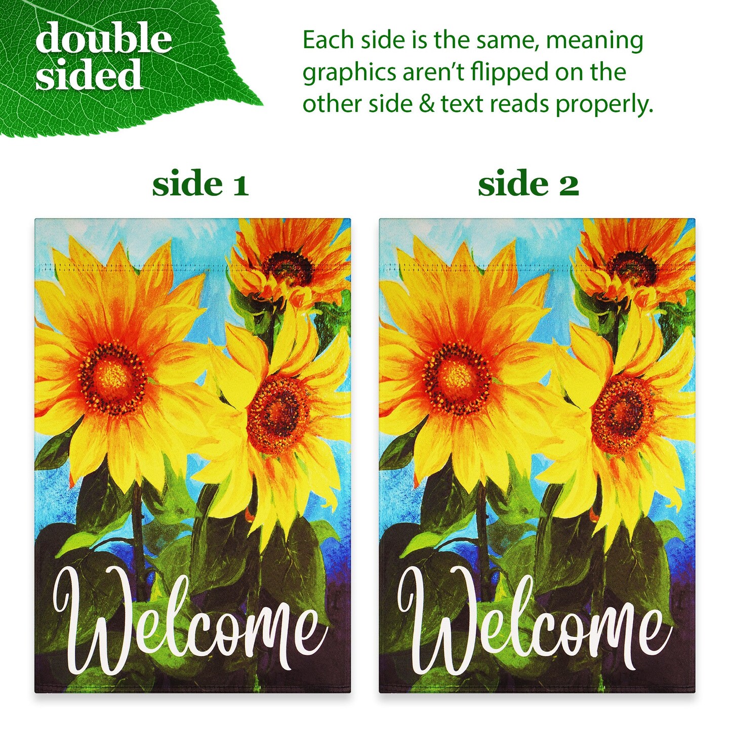 G128 Combo Pack: Garden Flag Stand Black 36 in x 16 in & Garden Flag Summer Decoration Welcome Sunflowers Blue Sky 12"x18" Double-Sided Blockout Fabric