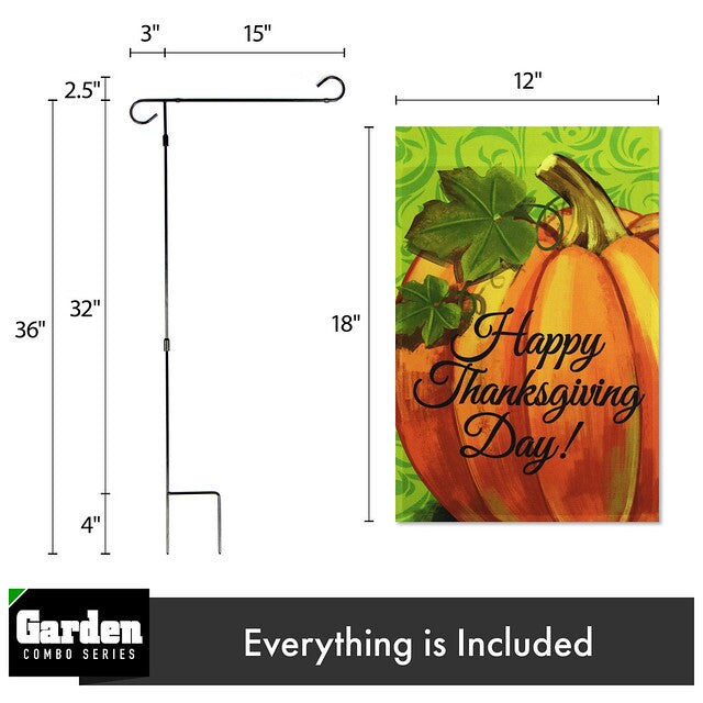 G128 Combo Pack: Garden Flag Stand Black 36x16 Inch & Garden Flag Happy Thanksgiving Pumpkin 12x18 Inch