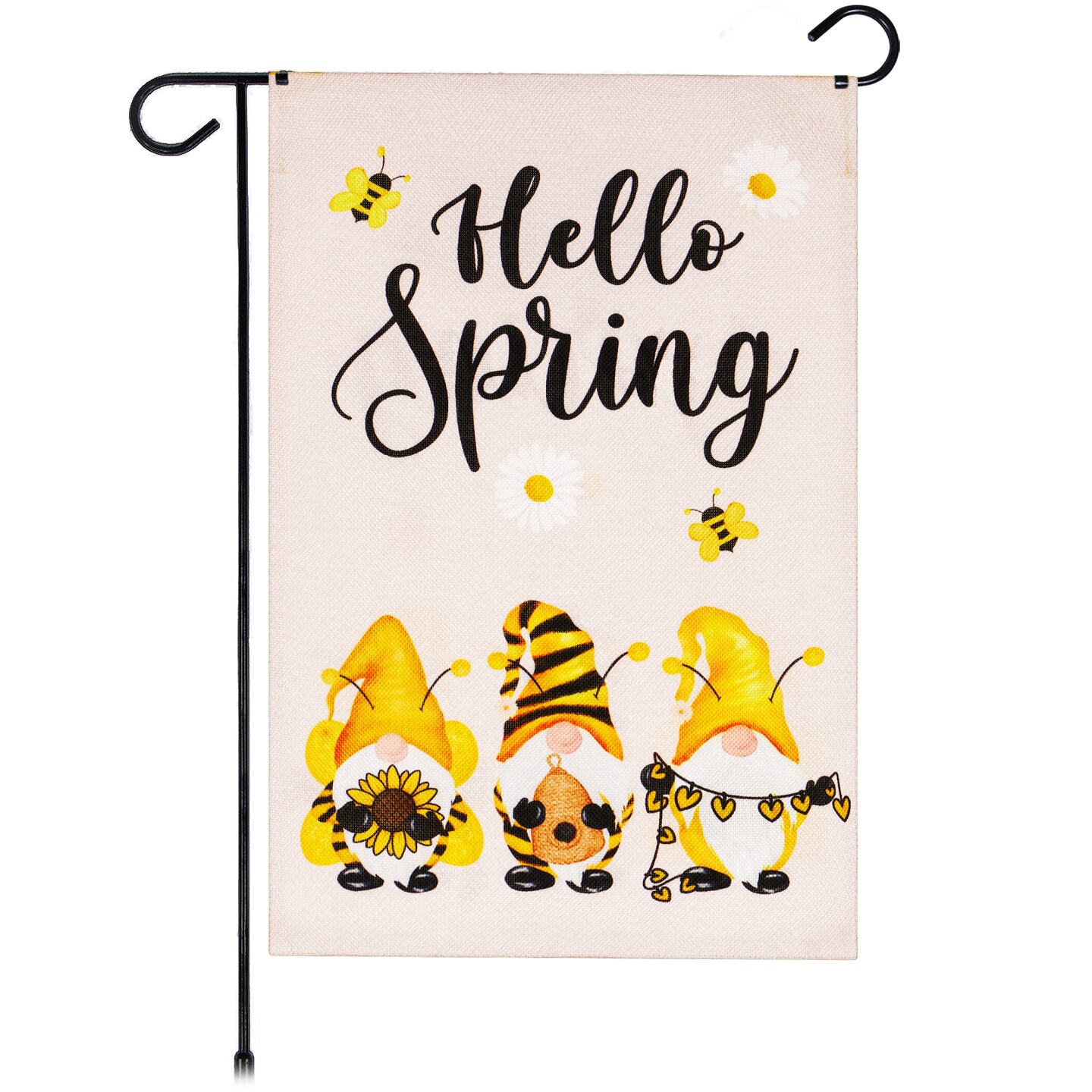 G128 Garden Flag Hello Spring Three Bee Gnomes 12"x18" Burlap Fabric