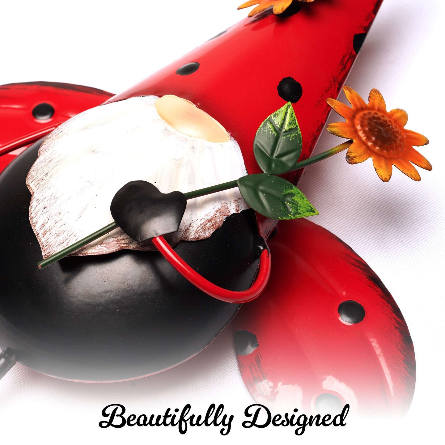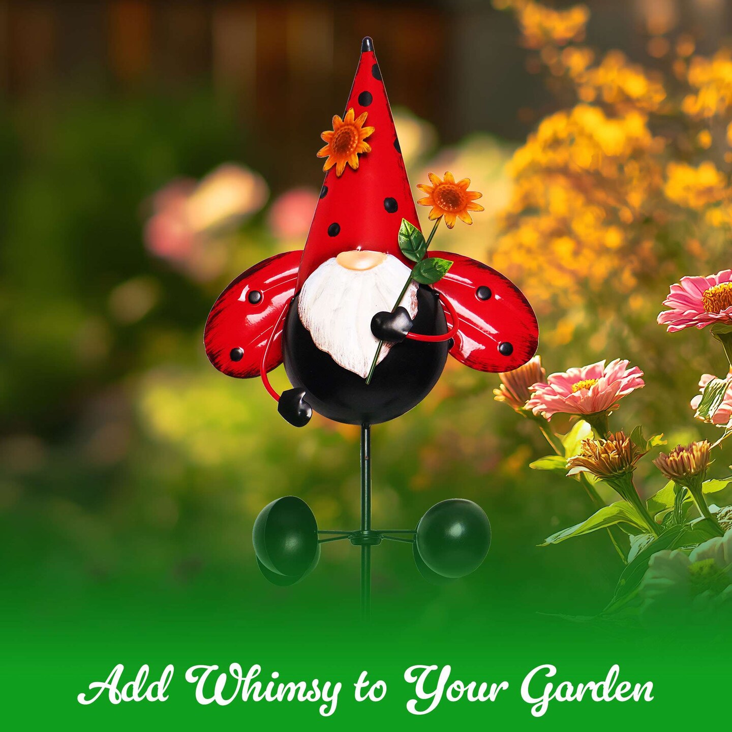 G128 Gnome Labybug Metal Yard Wind Spinner Stake | Outdoor 48 inch Gnome Statue Decorations 360 Degrees Swivel Wind Spinner for Patio Garden Backyard