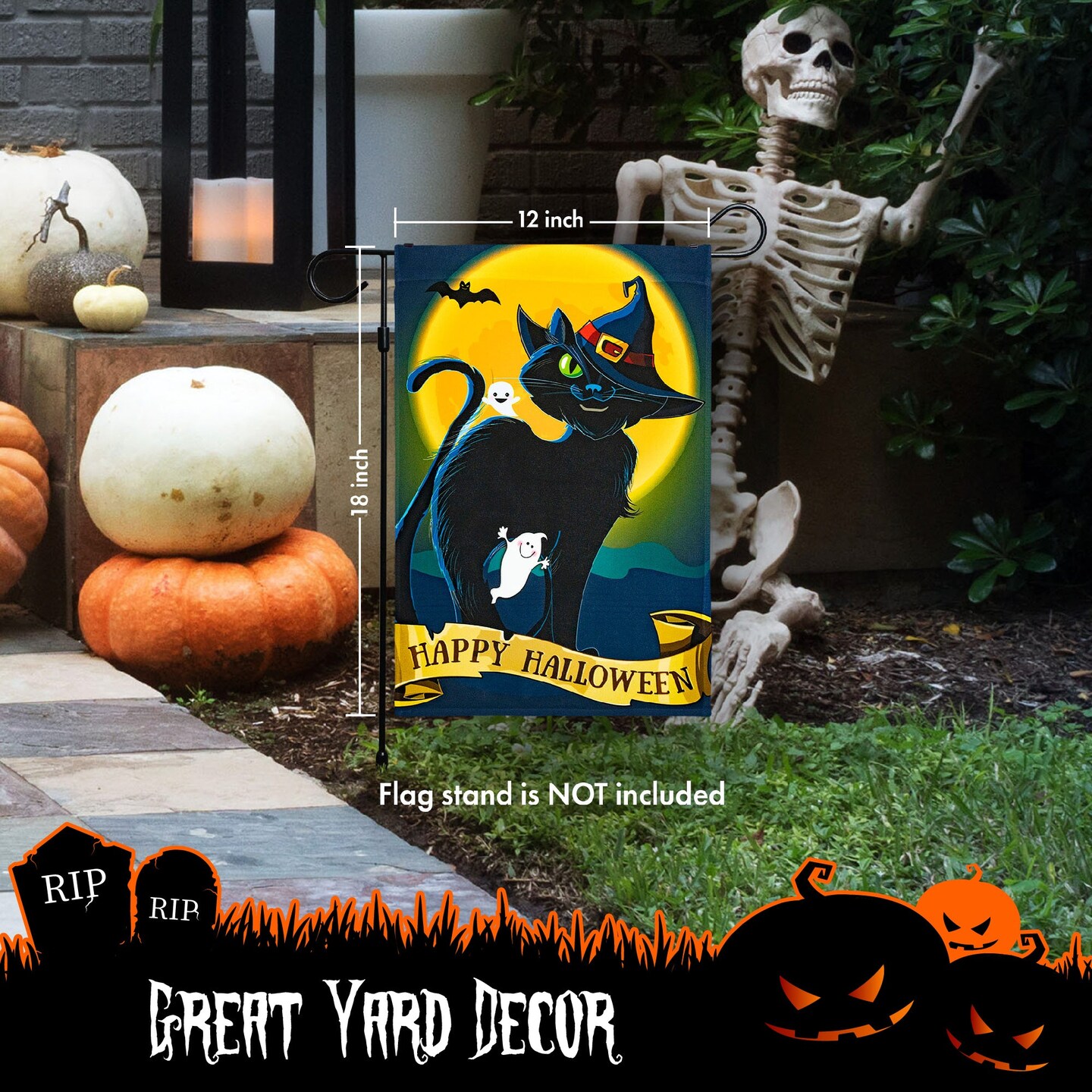 G128 - Halloween Garden Flag, Happy Halloween Quote with Black Cat Garden Yard Decorations, | 12x18 Inch | Printed 150D Polyester - Rustic Holiday Seasonal Outdoor Flag