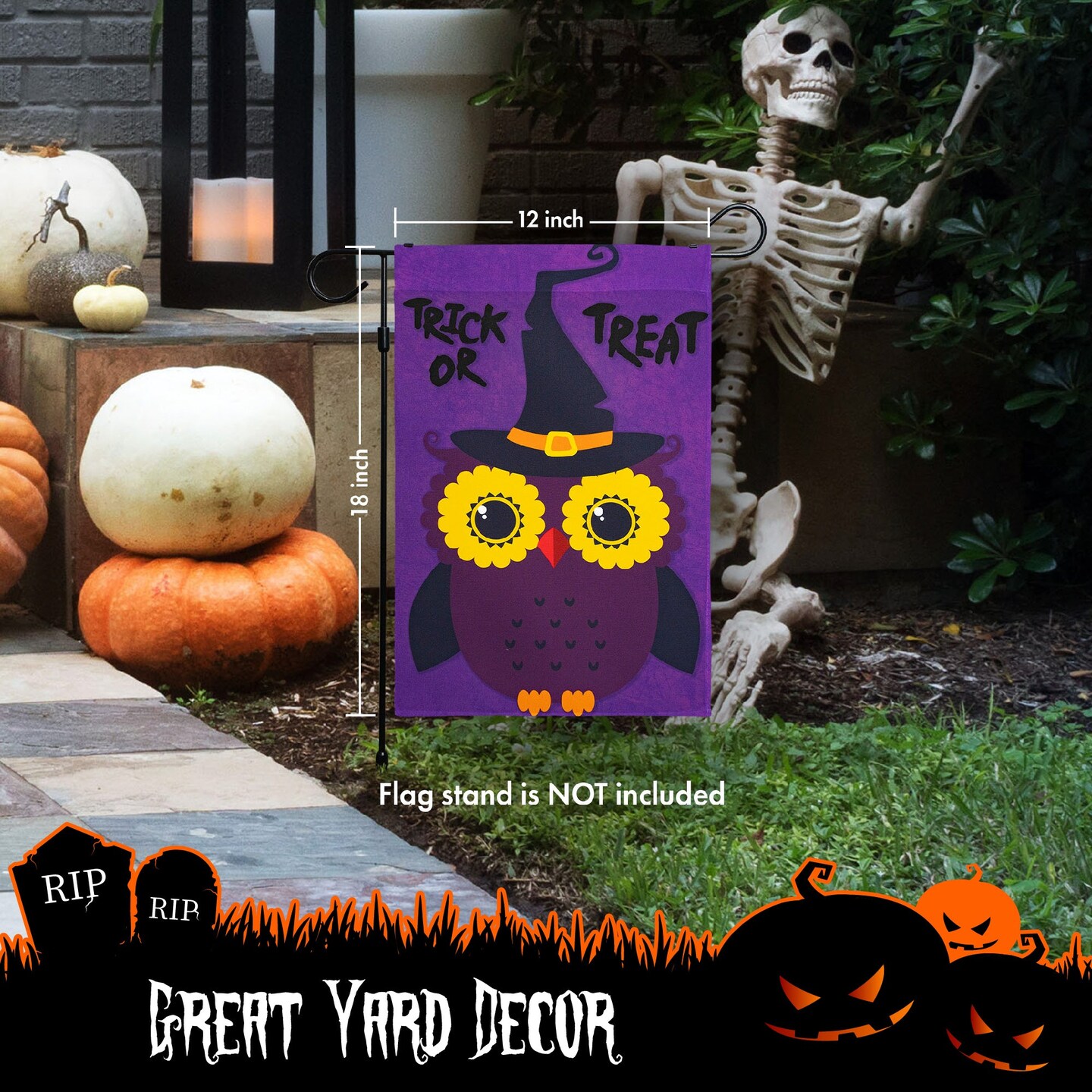 G128 - Halloween Garden Flag, Trick or Treat Quote with Cute Owl, Garden Yard Decorations, | 12x18 Inch | Printed 150D Polyester - Rustic Holiday Seasonal Outdoor Flag