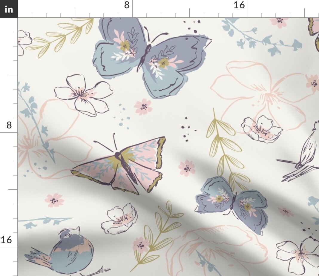 Garden Butterfly Songbird Pastel Pink Purple Botanical Whimsical Soft Pastels Floral Custom Printed Fabric by Spoonflower Various Fabrics by the Yard or Fat Quarter