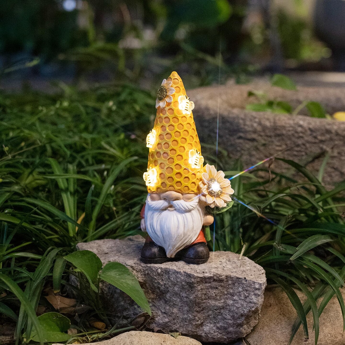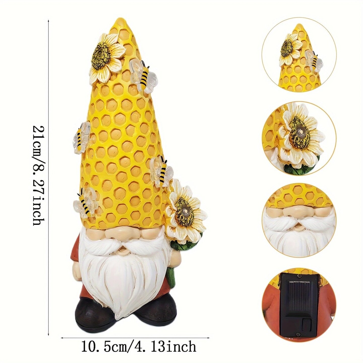 Garden Gnome Statue Solar Powered with Glowing Bees Sunflower Outdoor Funny Resin Figurine Decorations for Patio Yard Lawn Porch Housewarming Ornament Gift