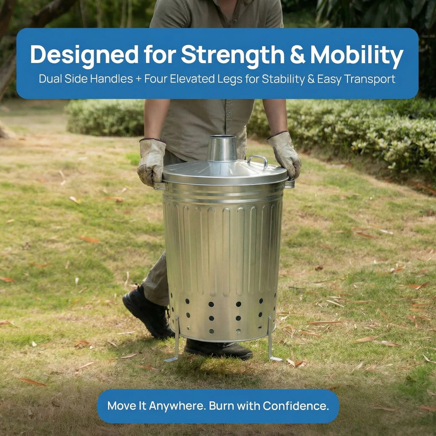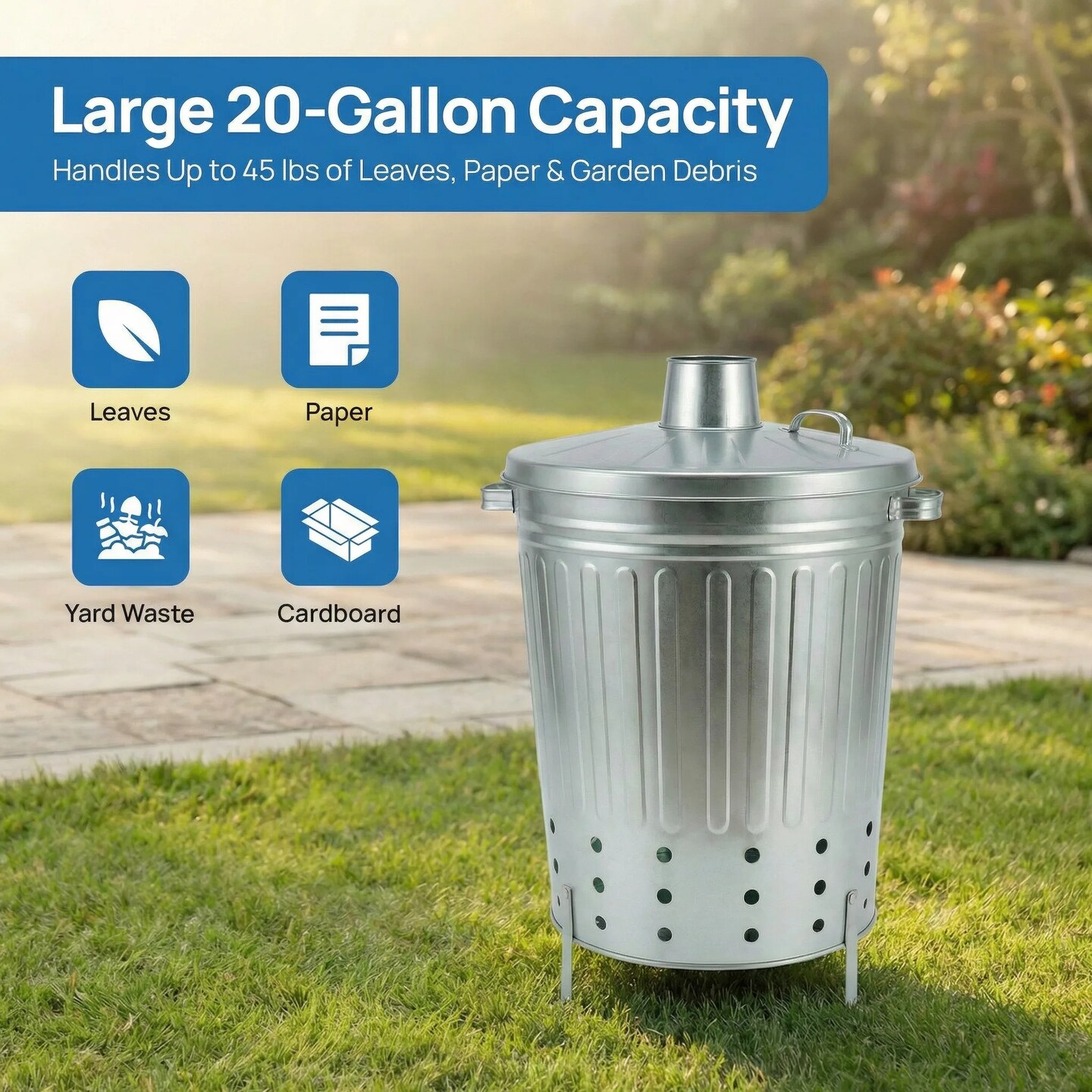 Gardenised Silver Galvanized Steel Outdoor Incinerator Can Large Garden Waste Burner Bin with Lid Ventilation Holes & Raised Legs for Yard Patio Backyard Leaves Paper and Household Debris