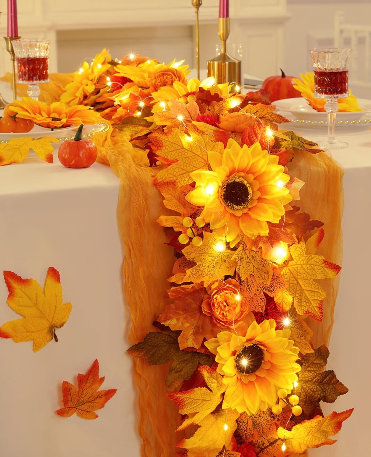 Garland for Mantle, Fall Garland with Lights Sunflower Maple Leaves Peony Marigold for Home Indoor Outdoor Decor