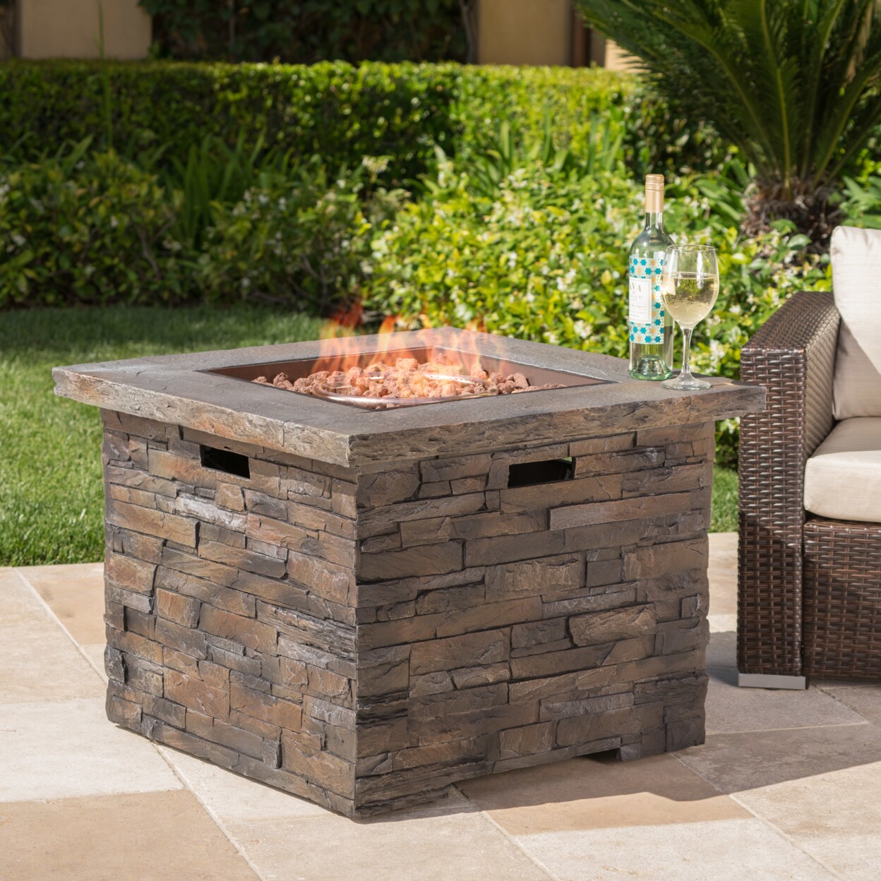 GDFStudio Stonecrest Outdoor Stone Finish 40000 BTU Propane Gas Square Firepit