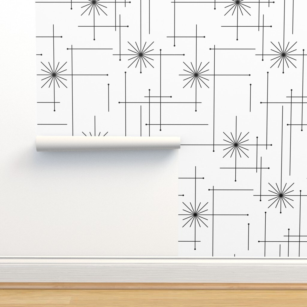 Geometric Mid Century Midcentury Modern Black White Monochrome Minimal Custom Pre-pasted Wallpaper by Spoonflower Pre-Pasted Wallpaper 2FT Wide