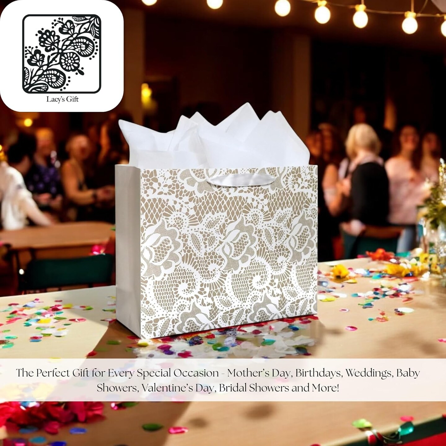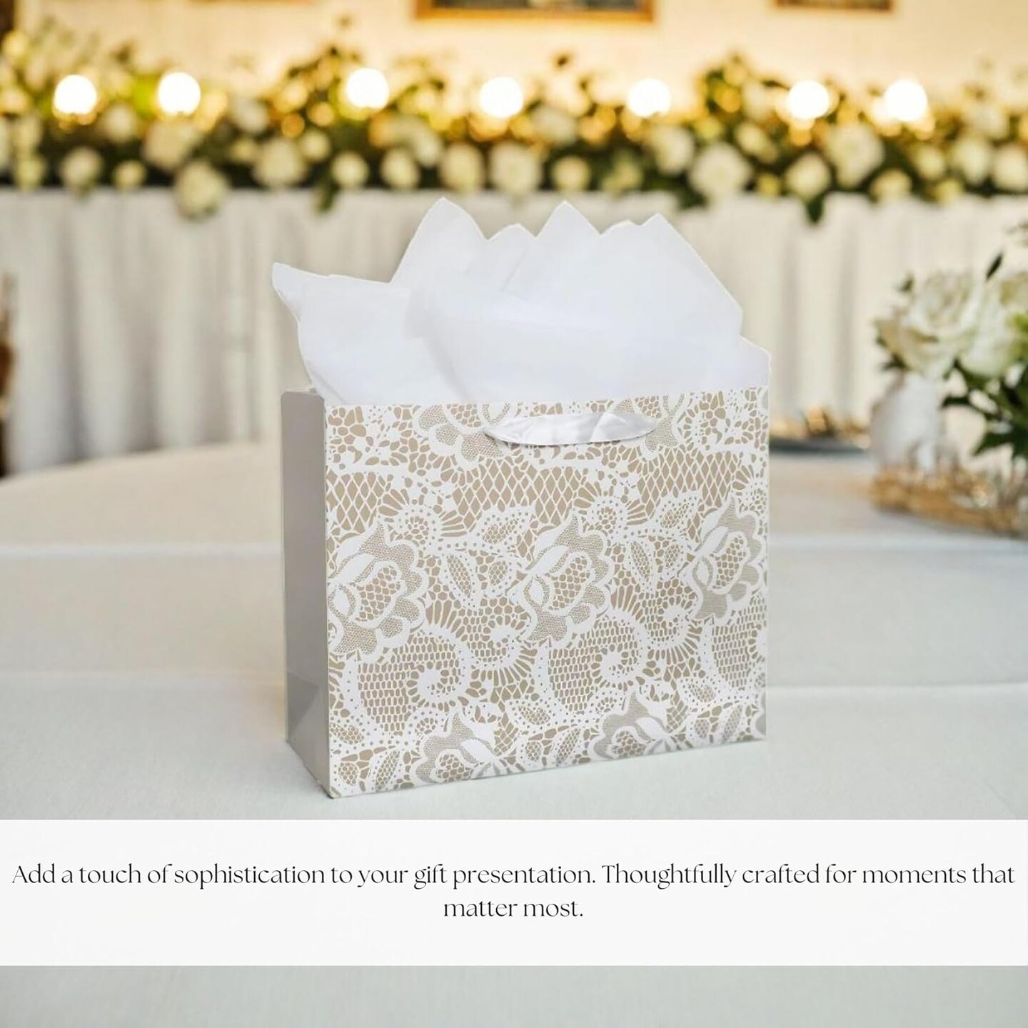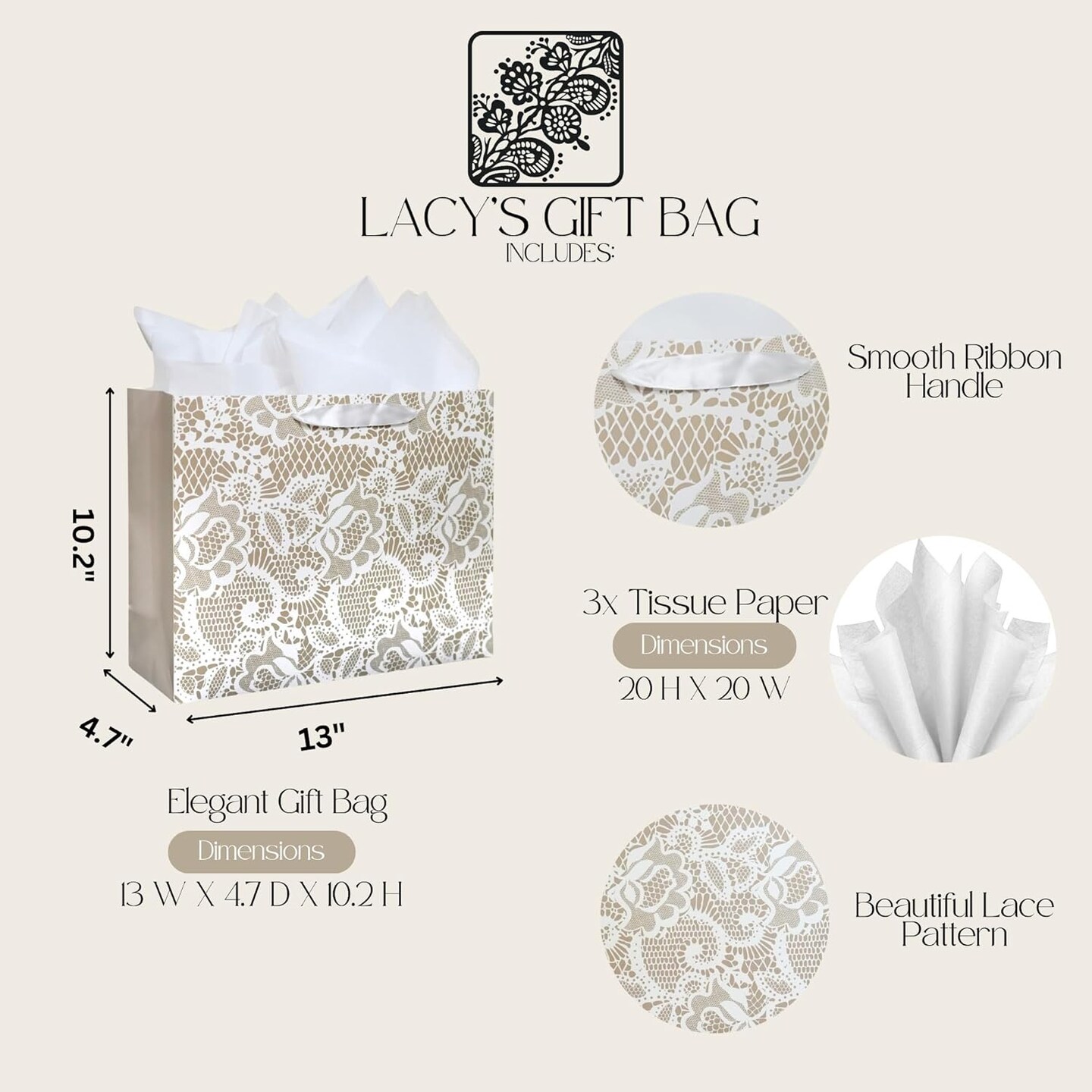 Gift Bag - Lace Patterned Large 13" Gift Bag with Tissue Paper, Elegant Gift Bag with Ribbon Handles for Weddings, Birthdays, Mother's Day, & Special Occasions. (White)
