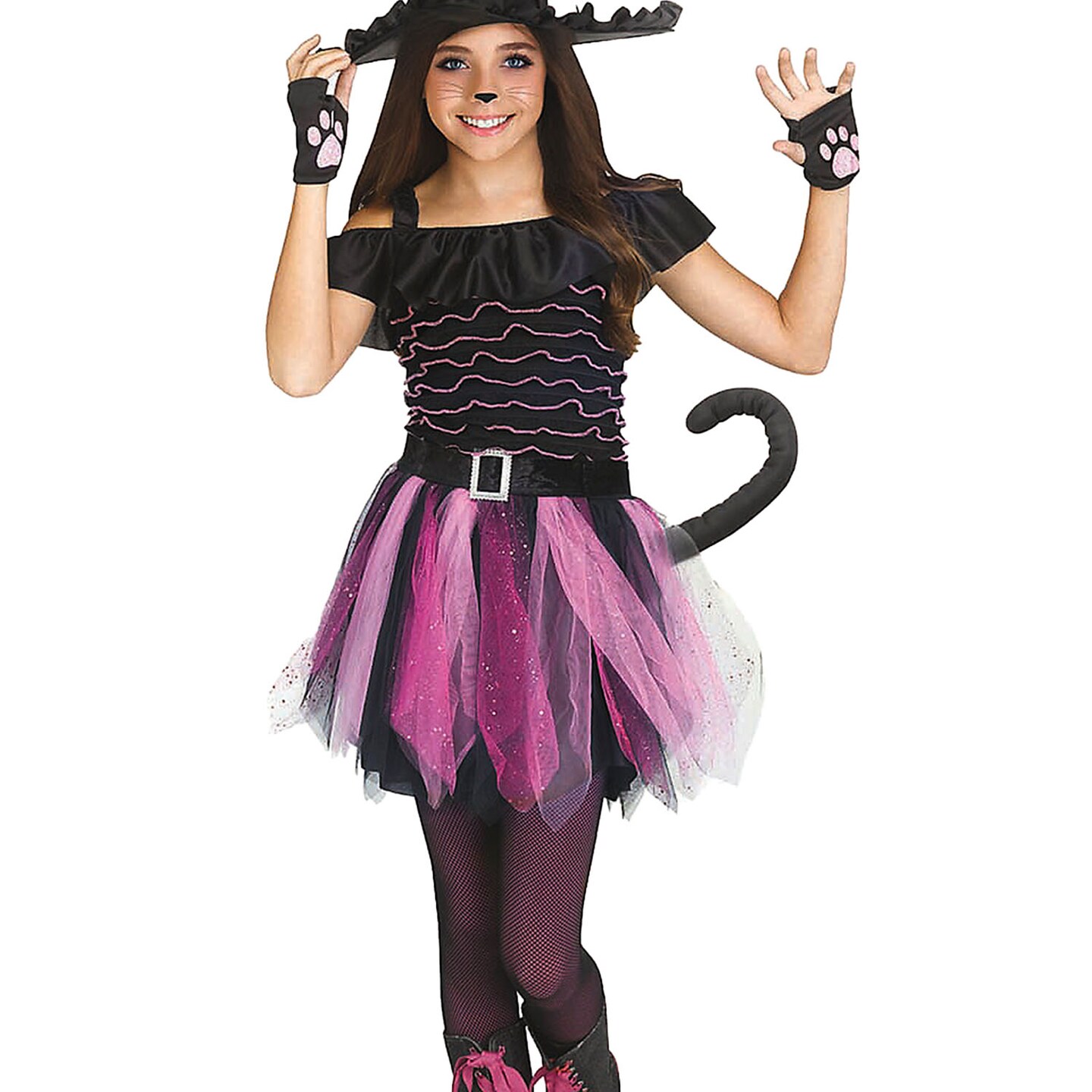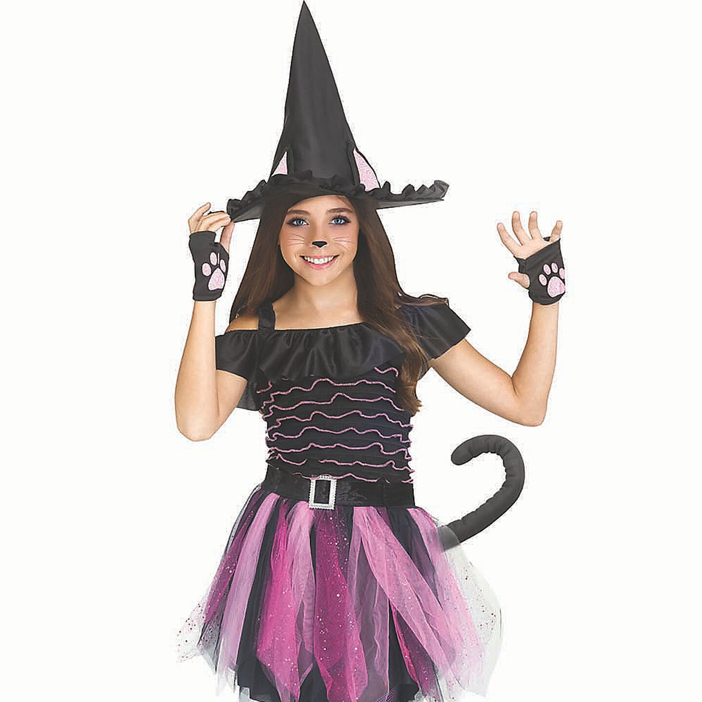 Girls Black Polyester Witch Kitty Costume with Hat and Accessories, Ideal for Costume Parties.