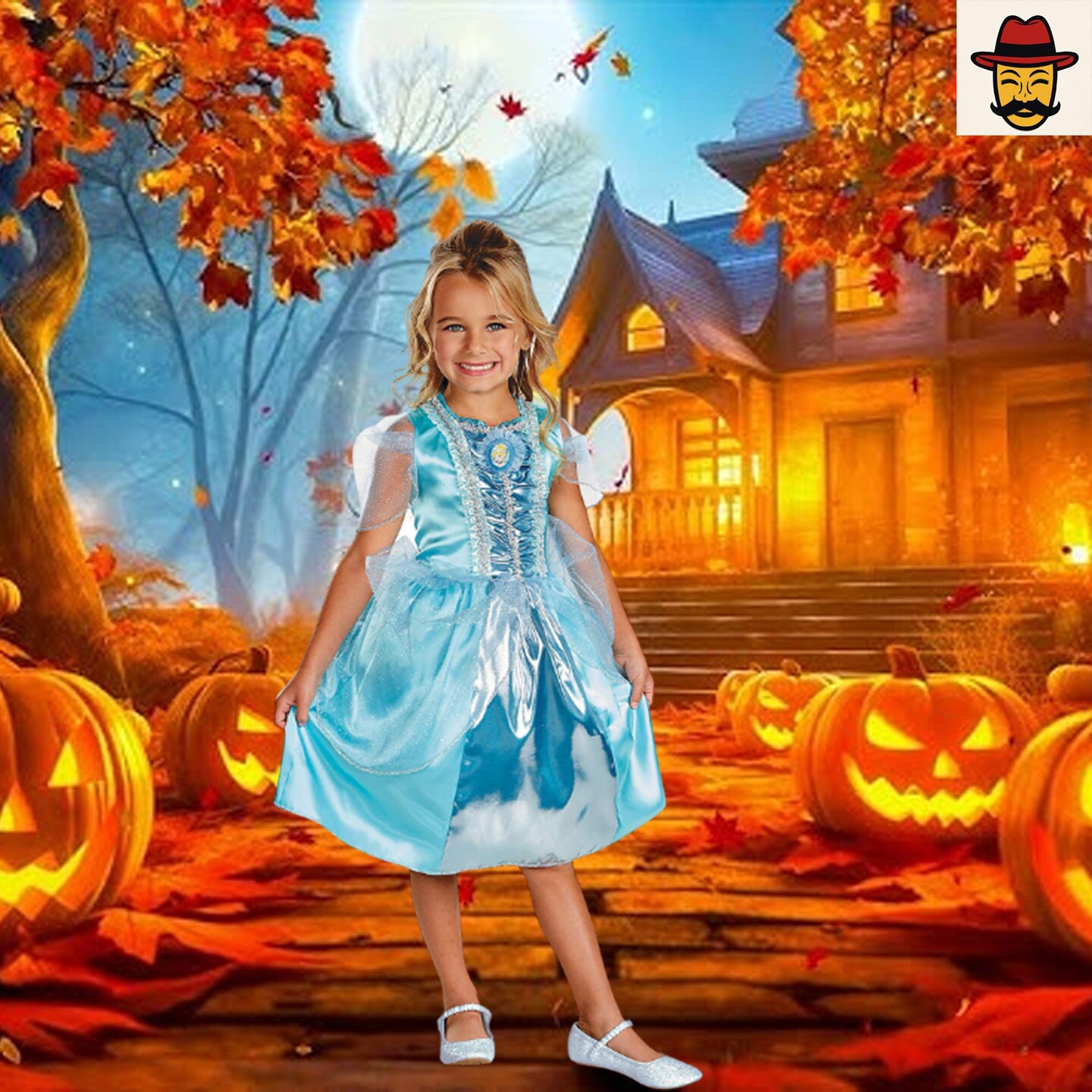 Girls Cinderella Sparkle Costume Blue Satin Dress with Sheer Sleeves