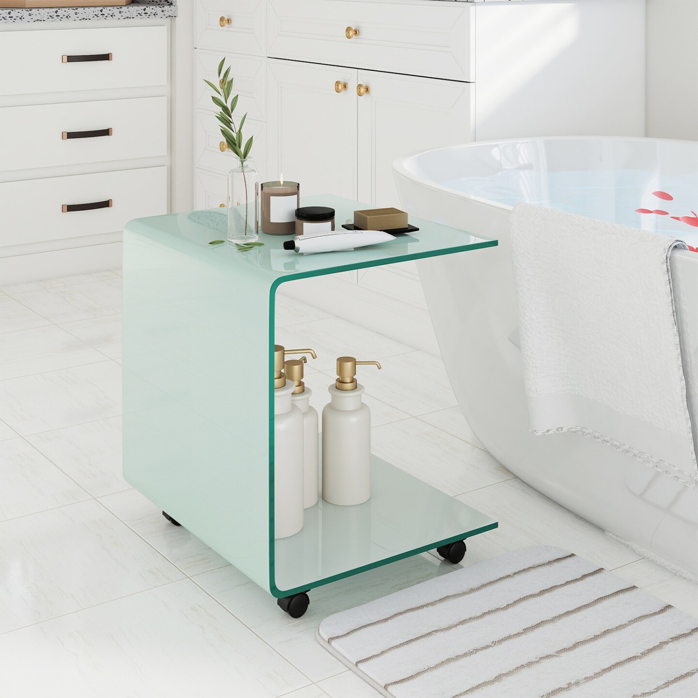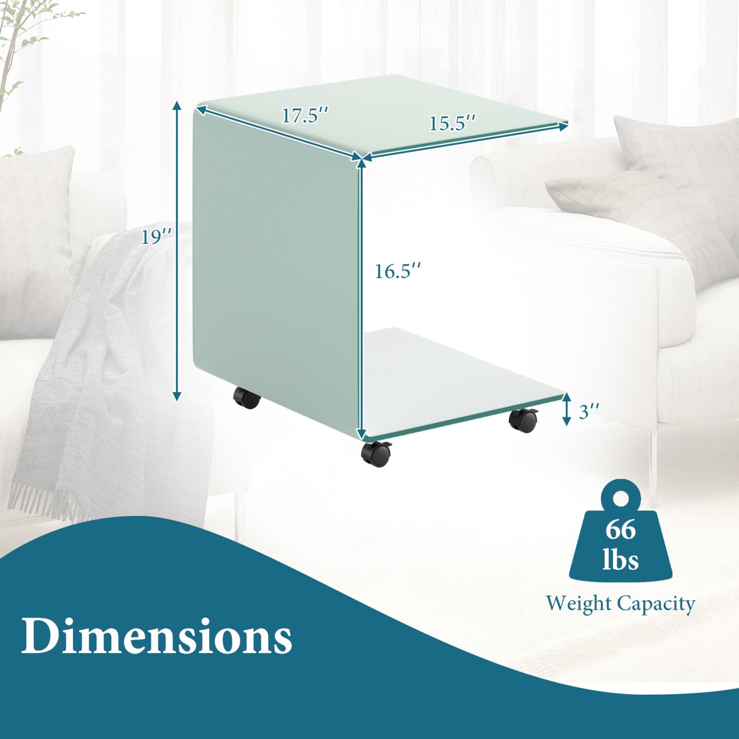 Glass End Table 2-Tier Shelf Mobile Detachable Wheels Sofa Side Table