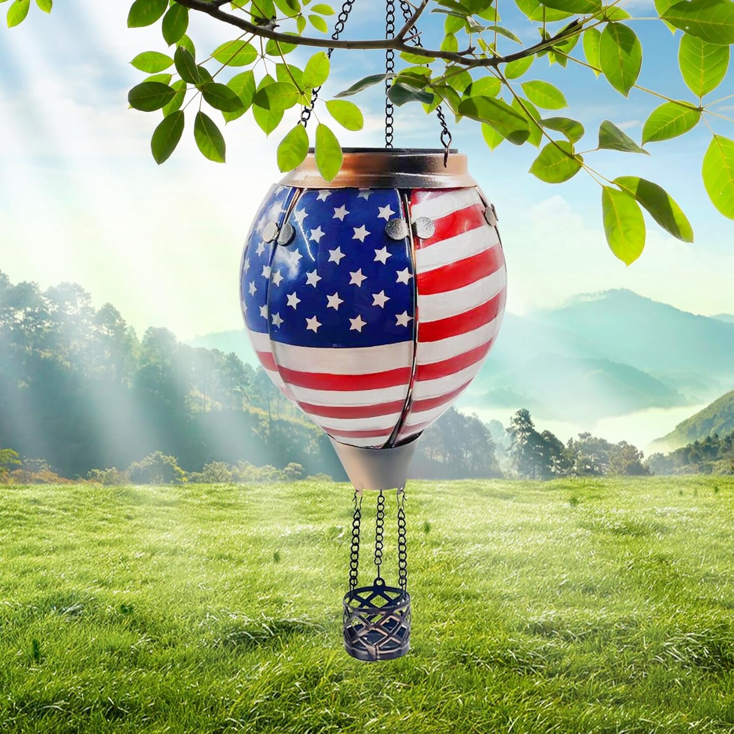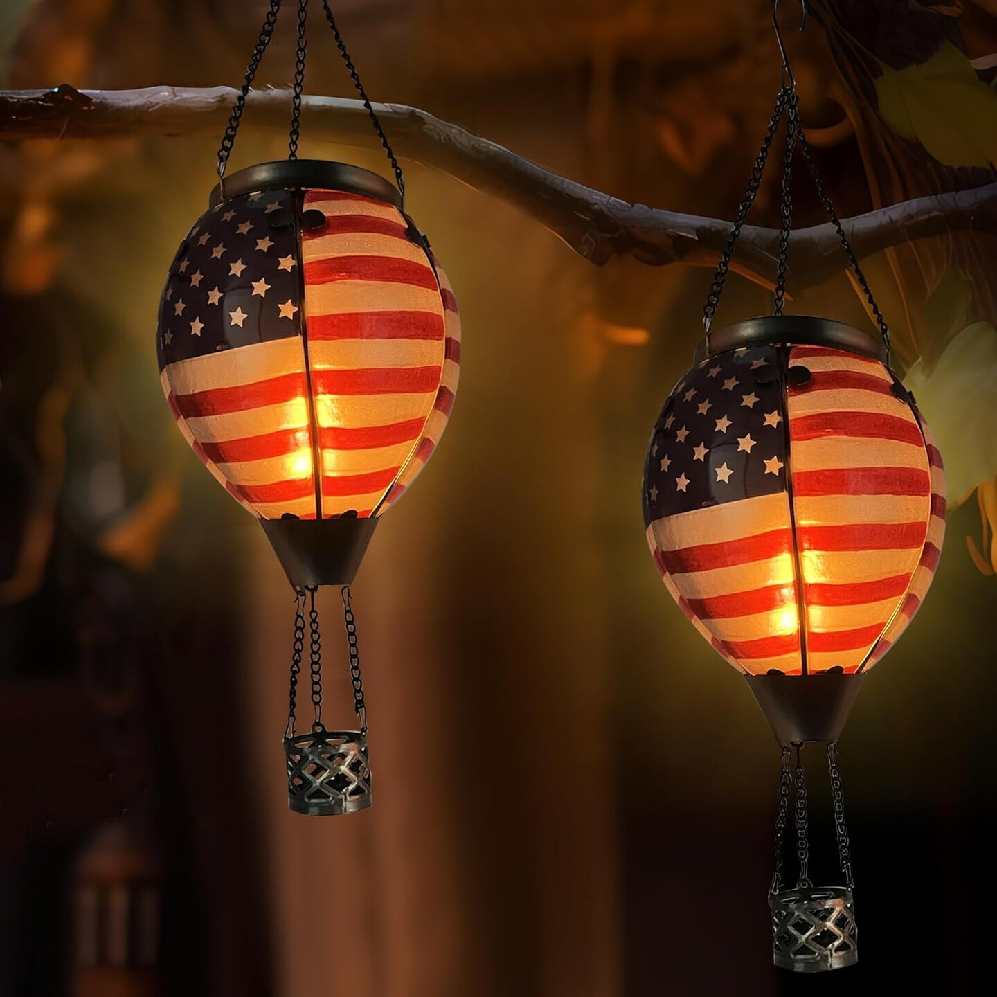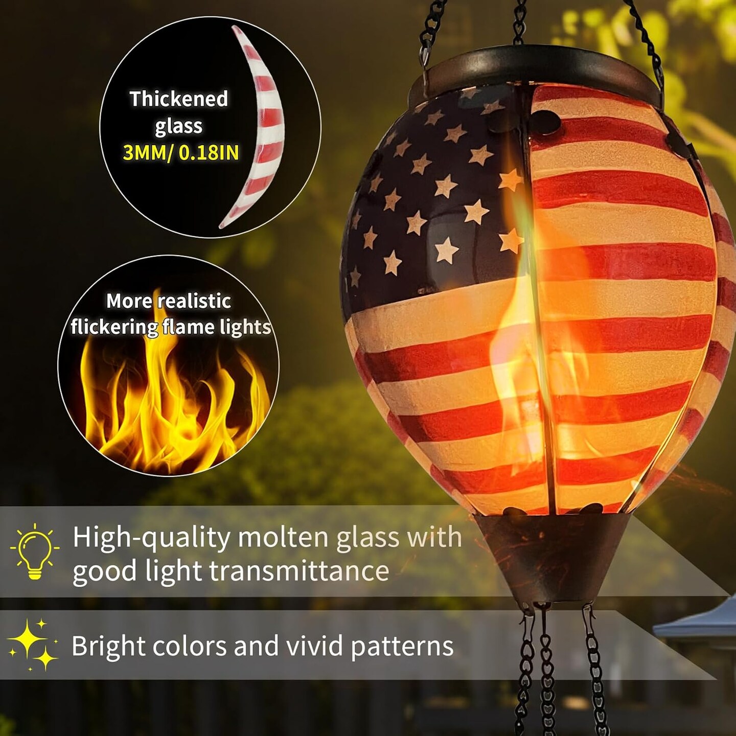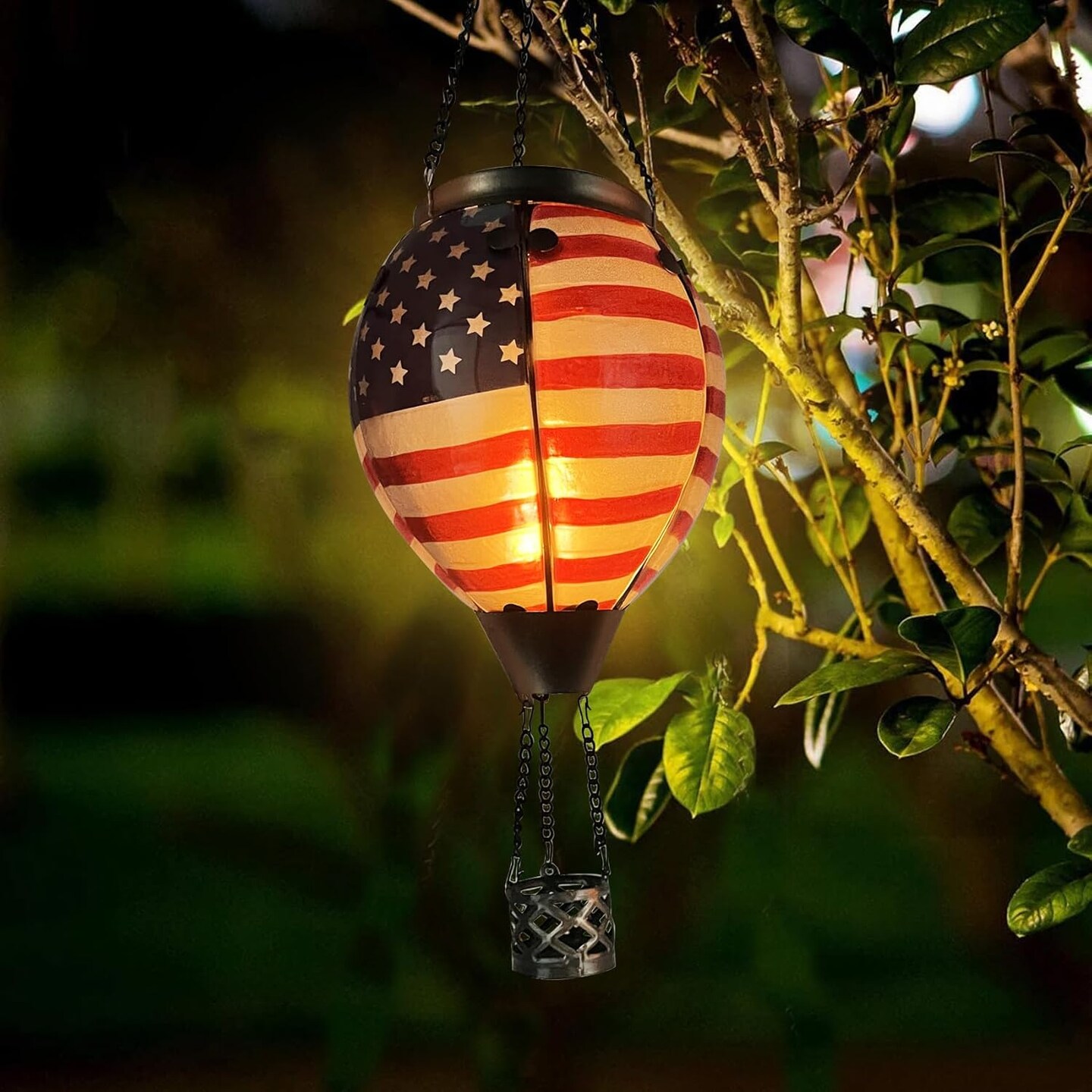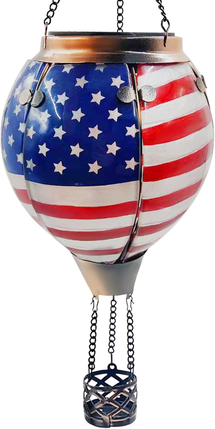 Glass Solar Hot Air Balloon Lantern with Flame Hanging Garden Flickering Light Outdoor Waterproof for Yard Patio Tree 4th of July Decorations