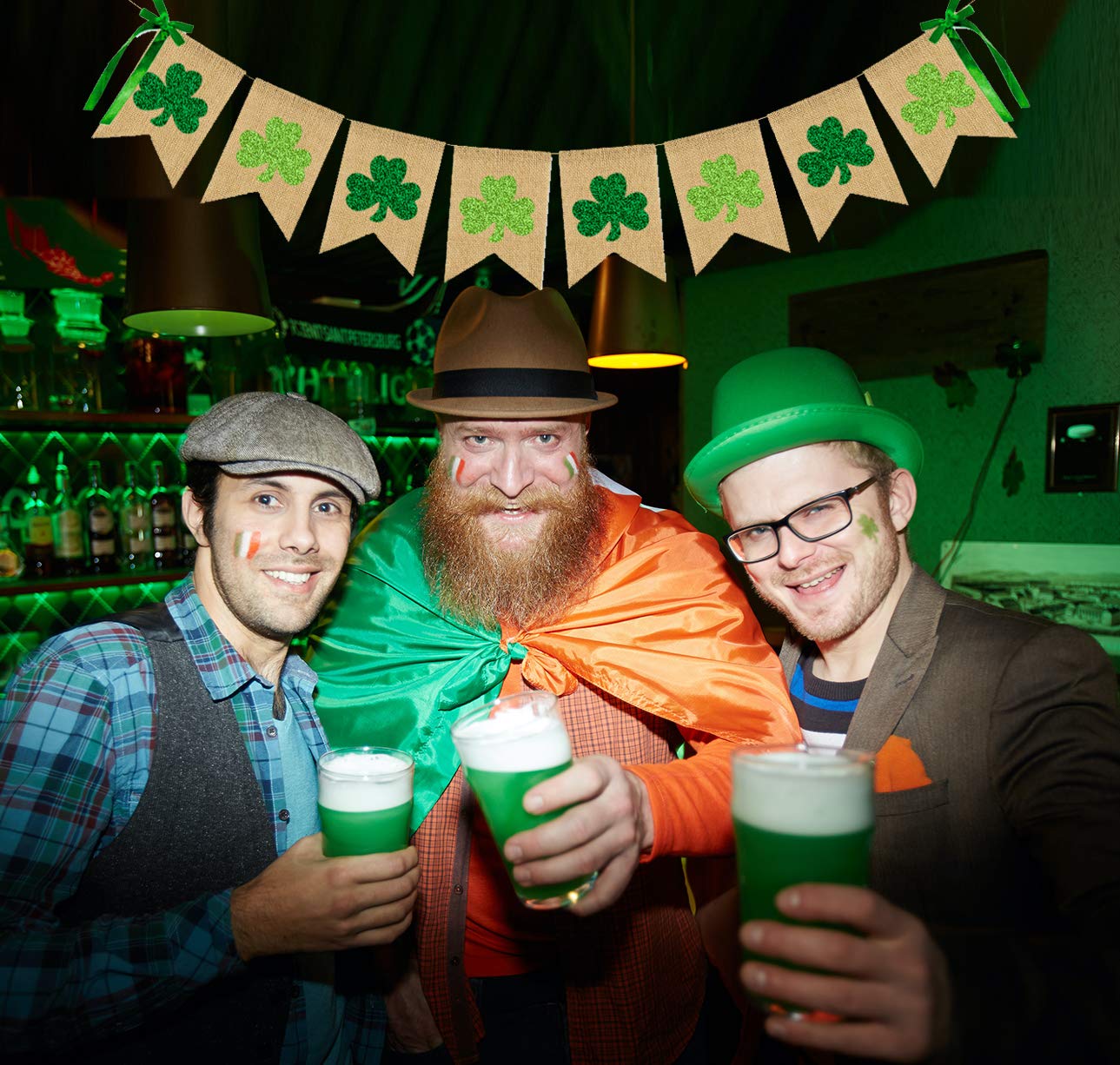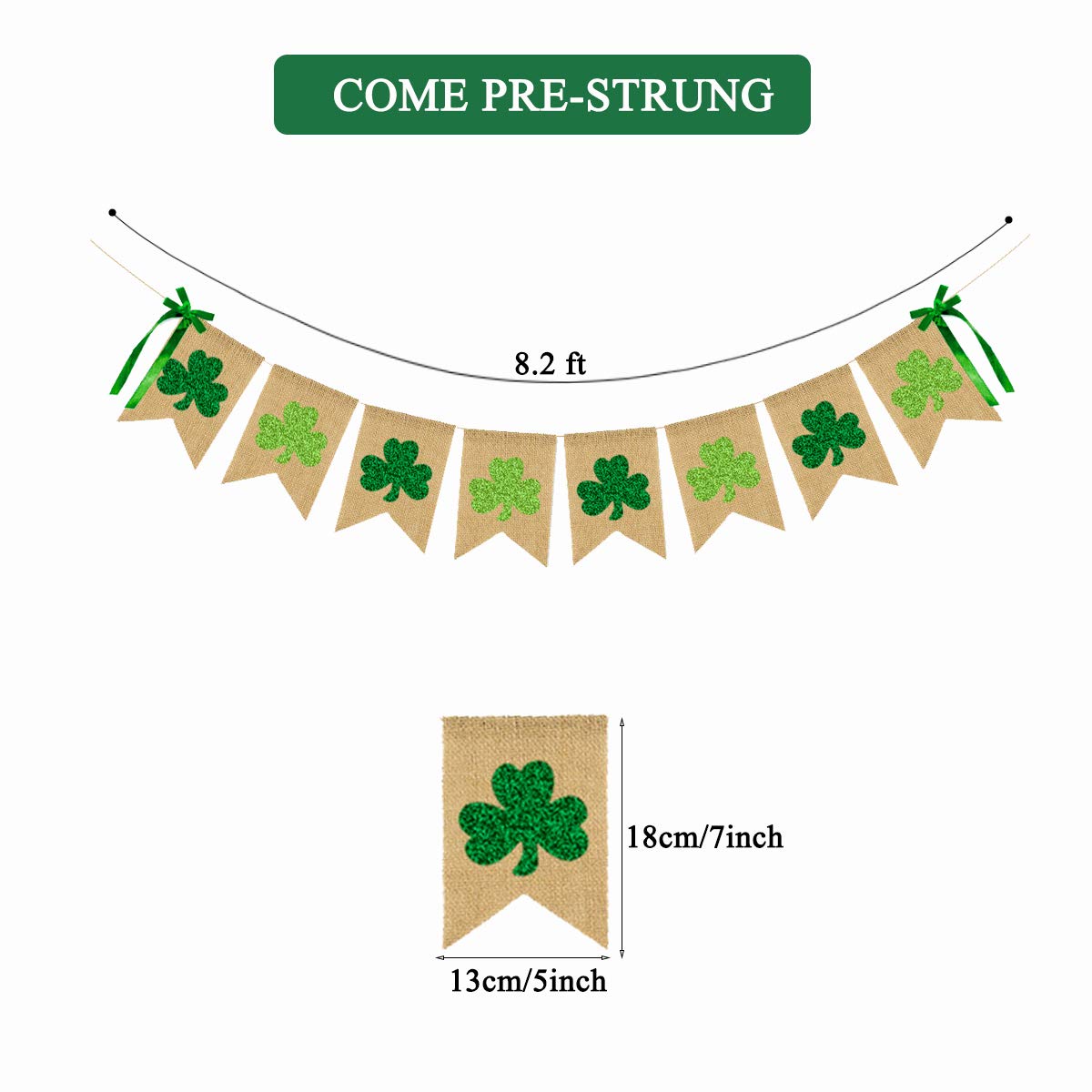 Glittery Shamrock Burlap Banner St. Patrick's Day Green Shamrock Clover Banner Garland with Bows Saint Patrick's Day Party Decorations for Irish Lucky Day St. Patty’s Day Home Outdoor Decor