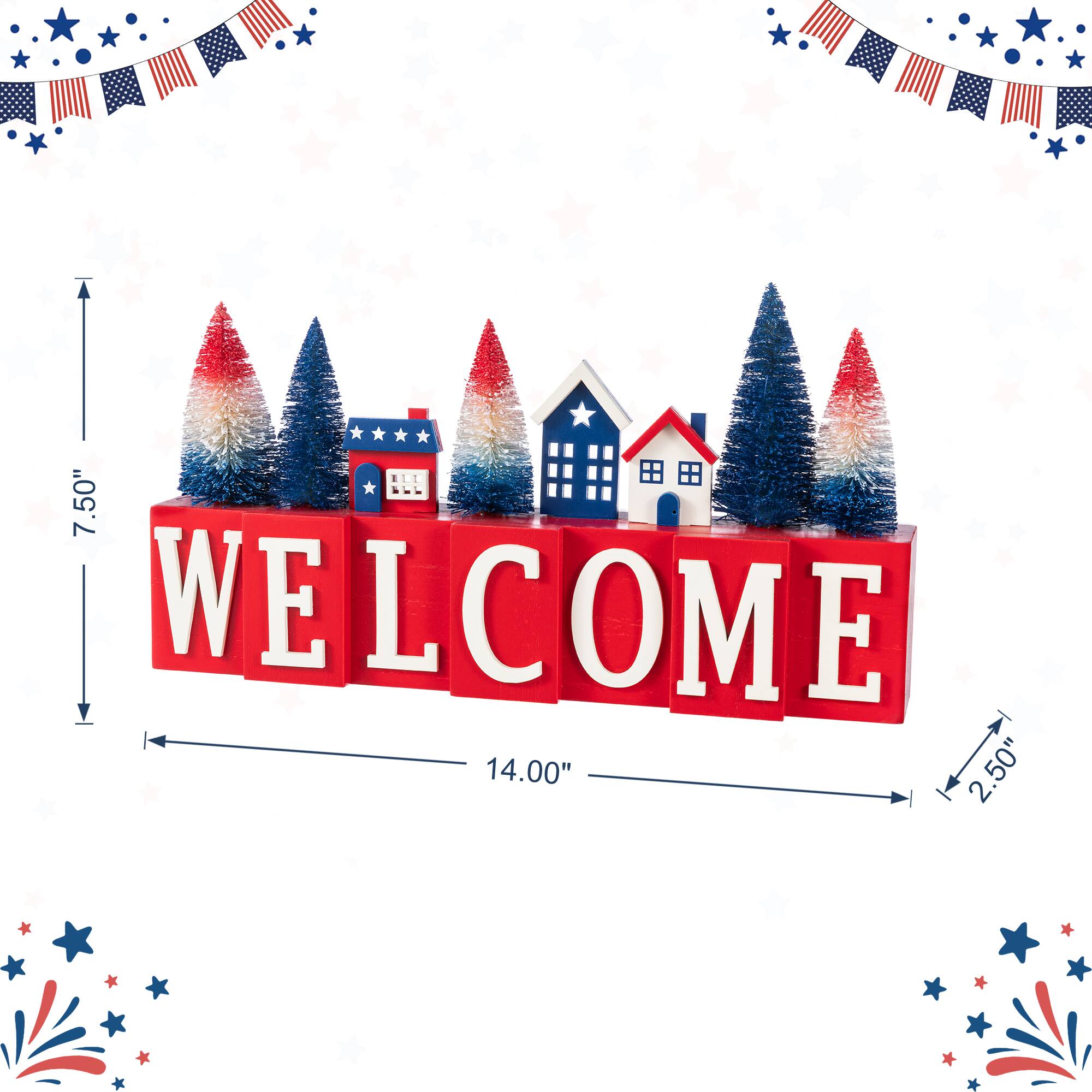 Glitzhome® 14" Patriotic Americana Wooden House & Brush Trees Table Decor