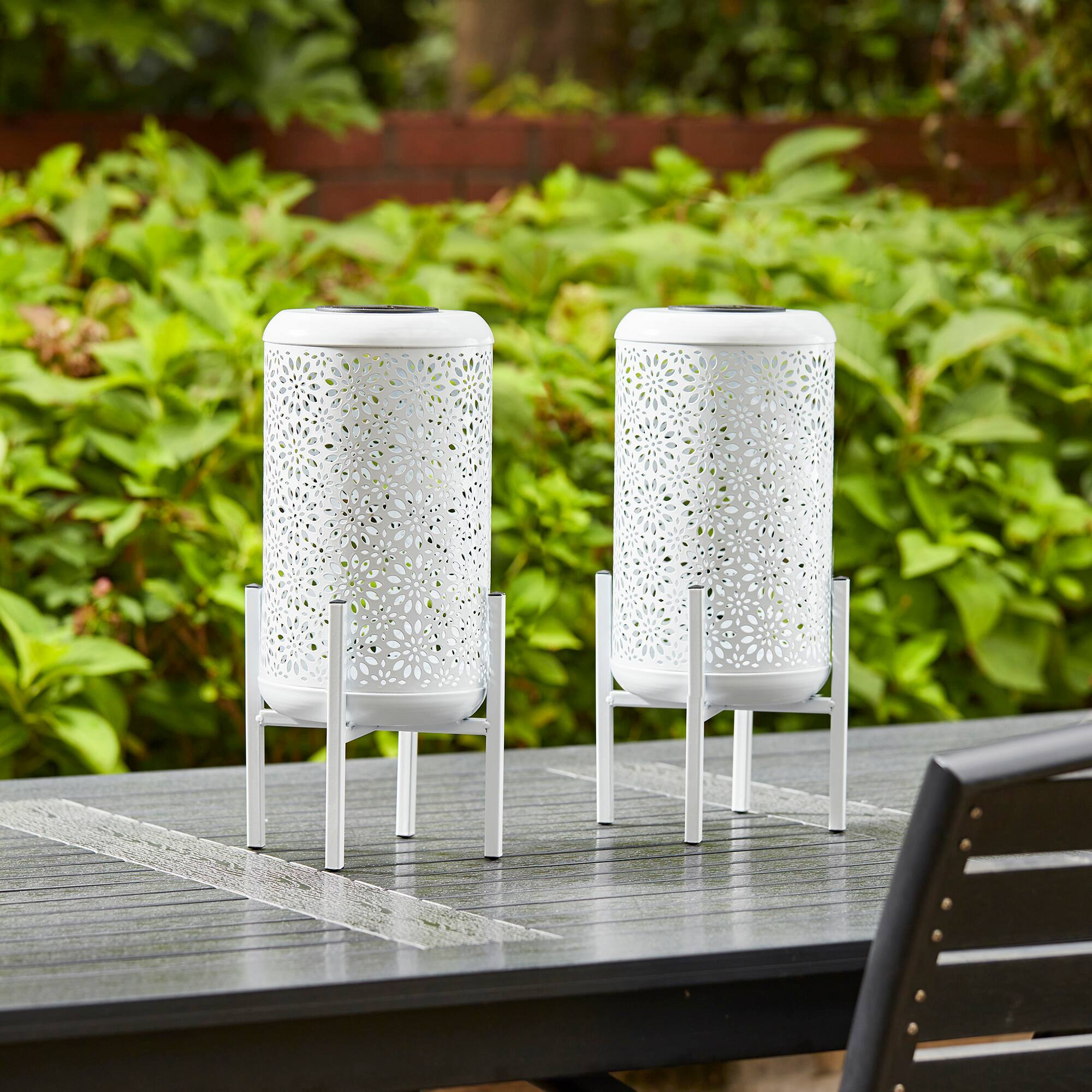 Glitzhome® 14.25" White Metal Cutout Flower Pattern Solar Powered LED Outdoor Lanterns, 2ct.