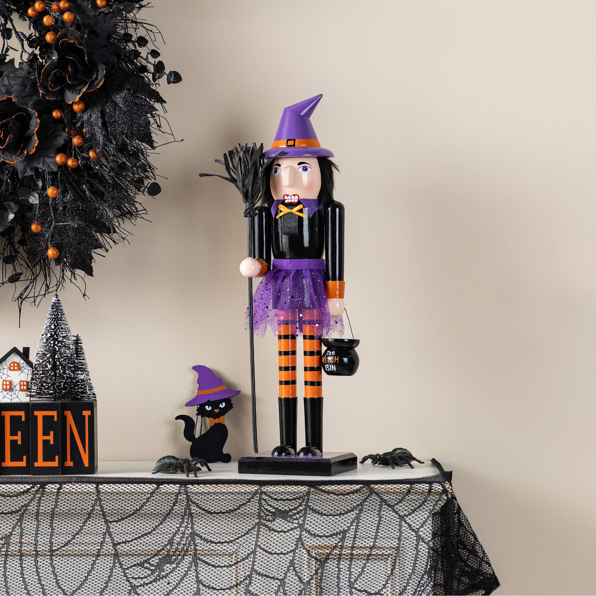 Glitzhome® 18.5"H Halloween Wooden Witch Nutcracker with Witch Cat Ornament