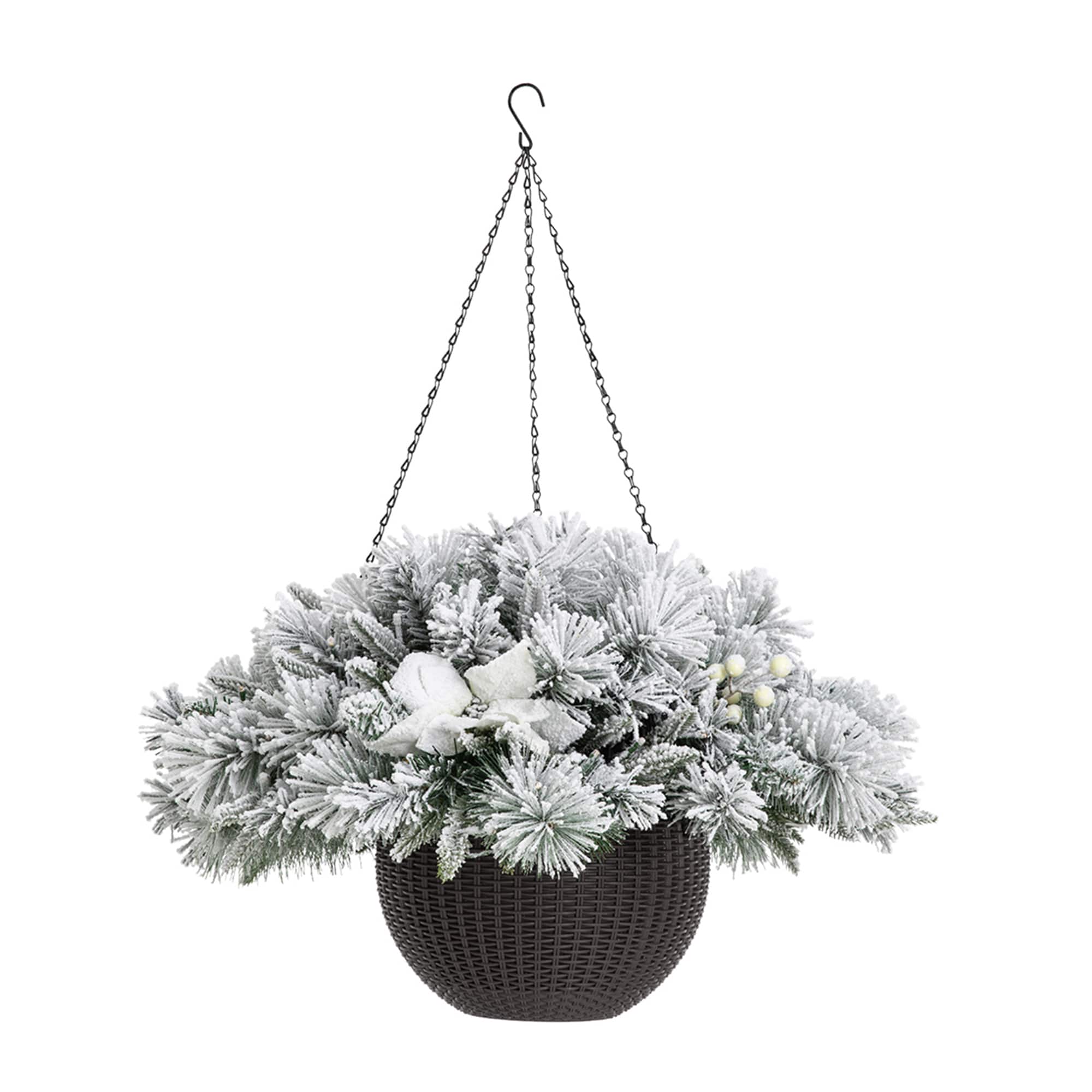 Glitzhome® 24" Pre-Lit Snow Flocked Christmas Artificial Pine Poinsettia Hanging Basket, White Lights