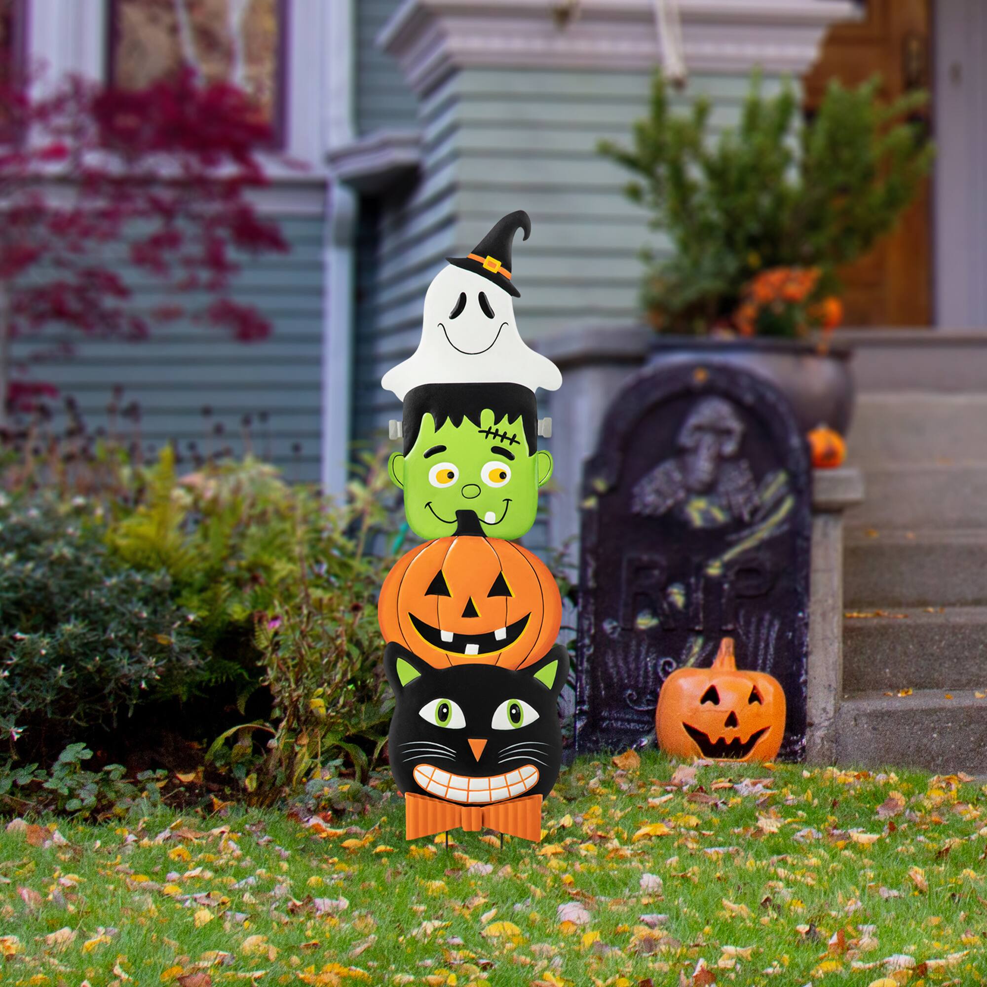Glitzhome® 3.5ft. Halloween Metal Stacked Ghost, Frankenstein, Black Cat and Pumpkin Yard Stake