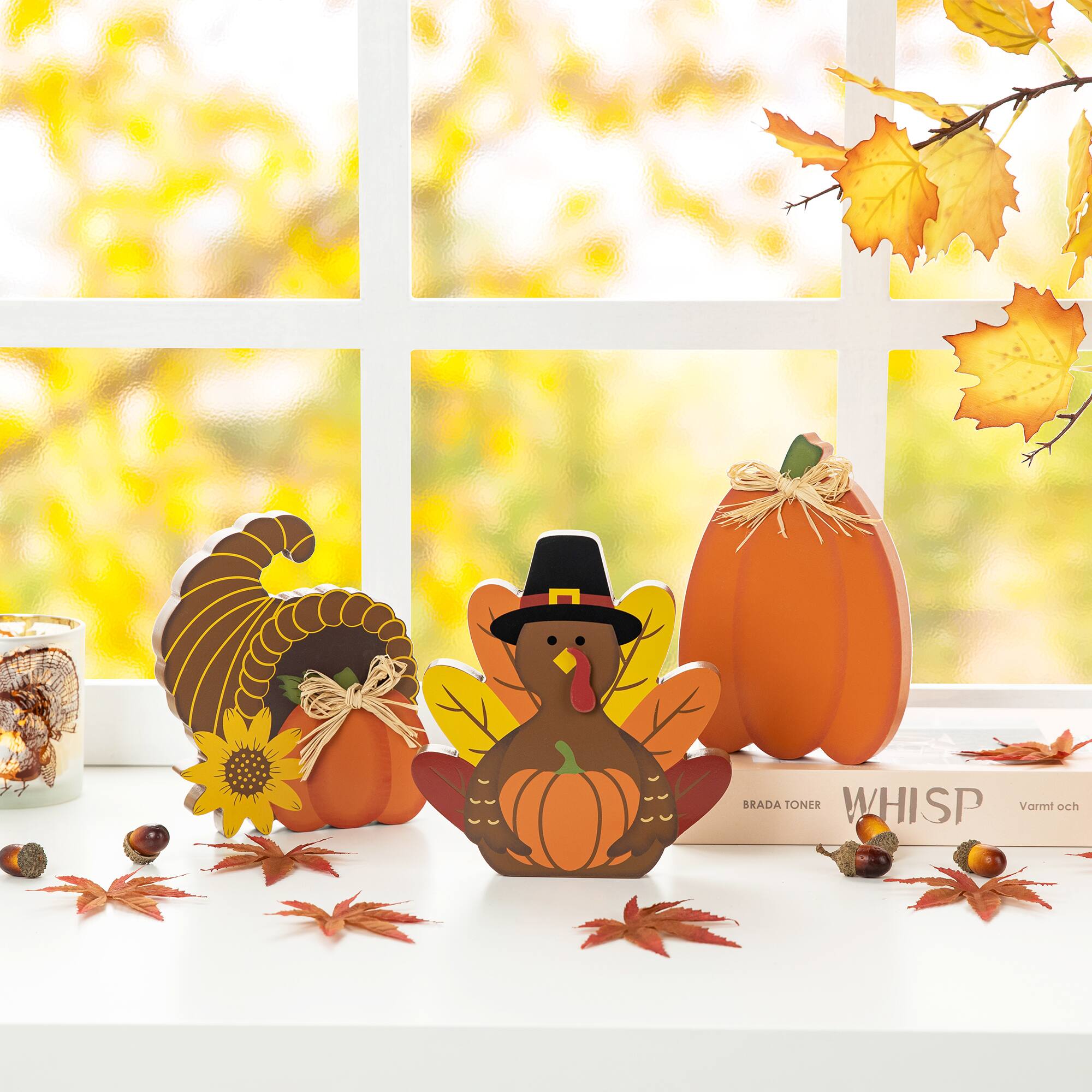 Glitzhome® 7" Thanksgiving Wooden Pumpkin, Turkey & Croissant Table Décor Set