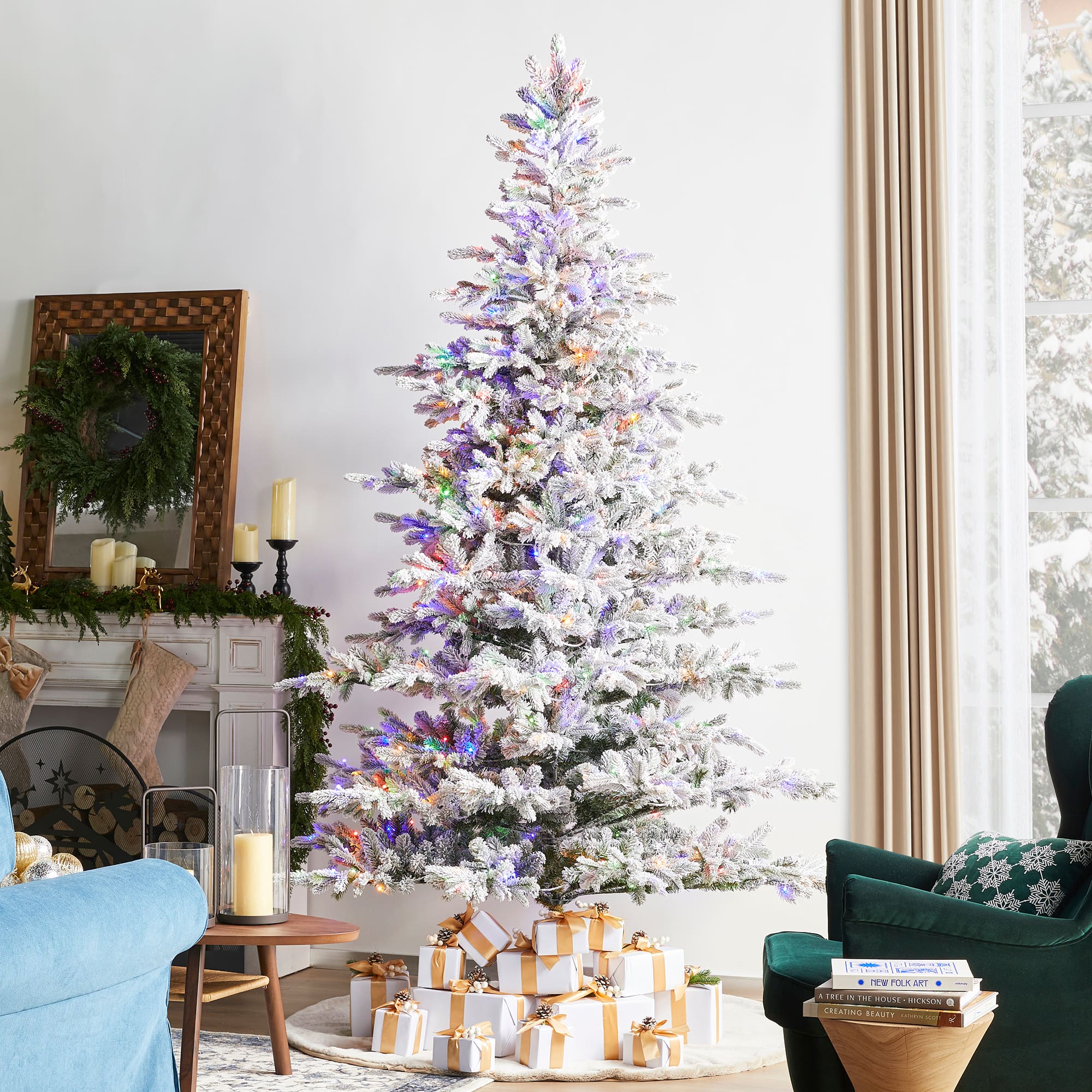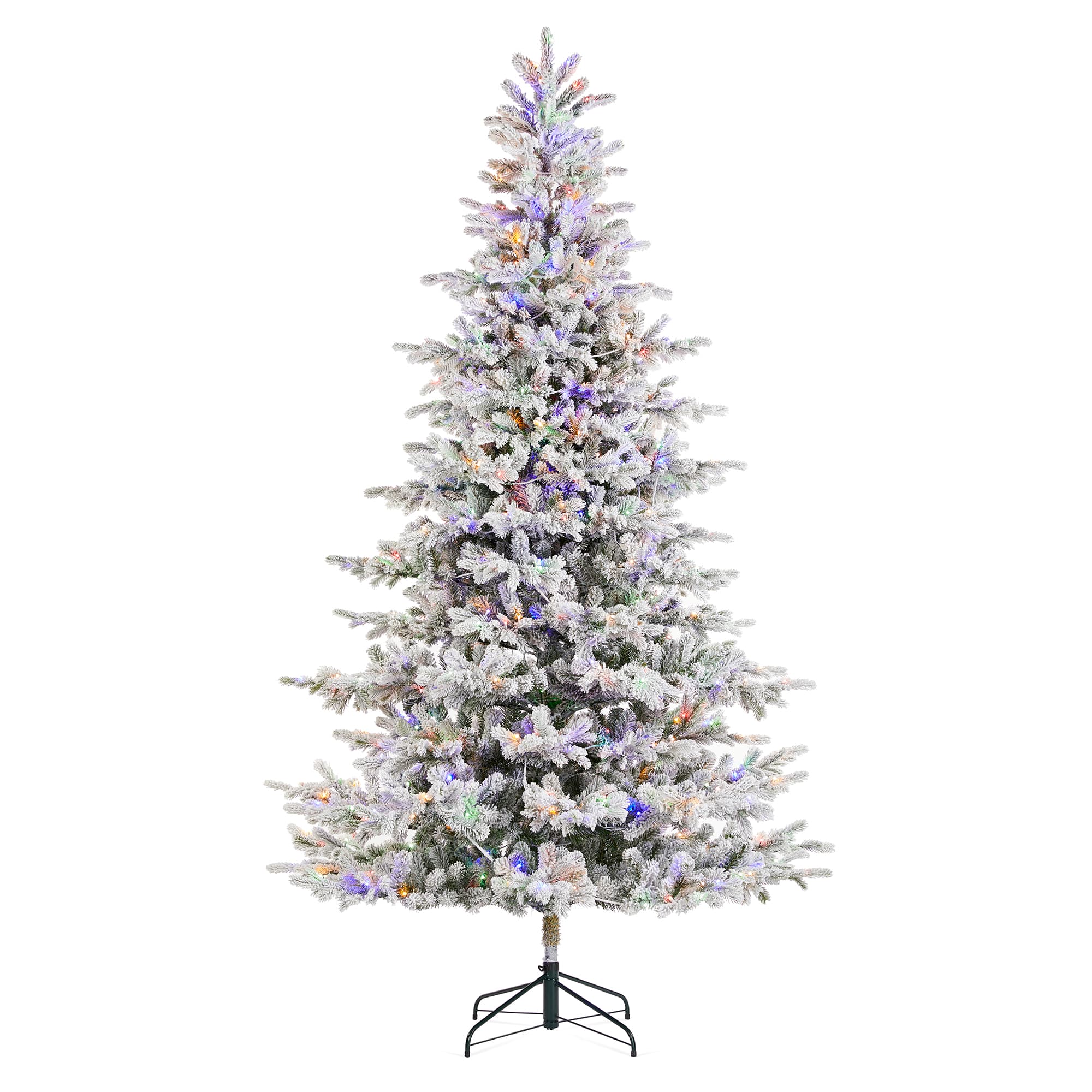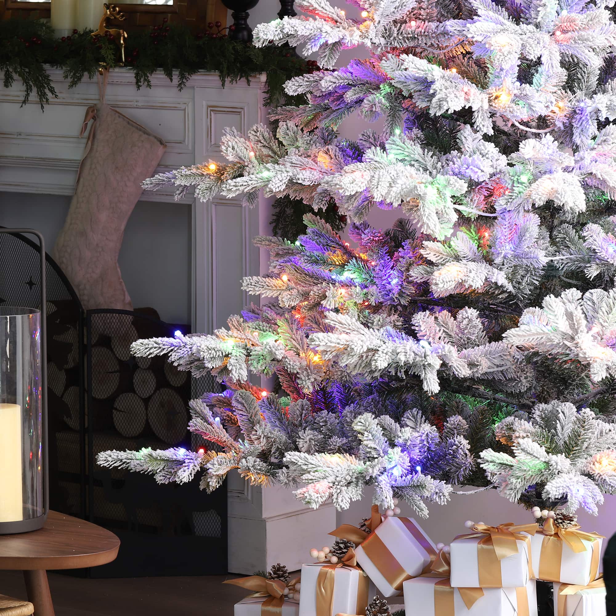 Glitzhome® 9ft Pre-Lit Flocked Full Fir Artificial Christmas Tree, Multicolor LED Lights