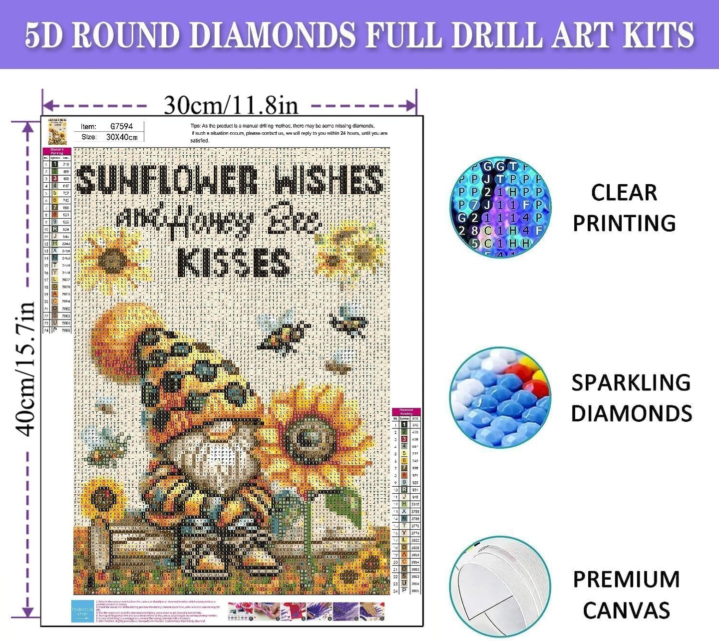 Gnome Diamond Painting Kits for Adults, Gnome Sunflower Bee Diamond Art Kits for Adults Beginners, 5D DIY Full Drill Round Gem Art Craft Painting for Home Wall Decor 12 x 16 Inch