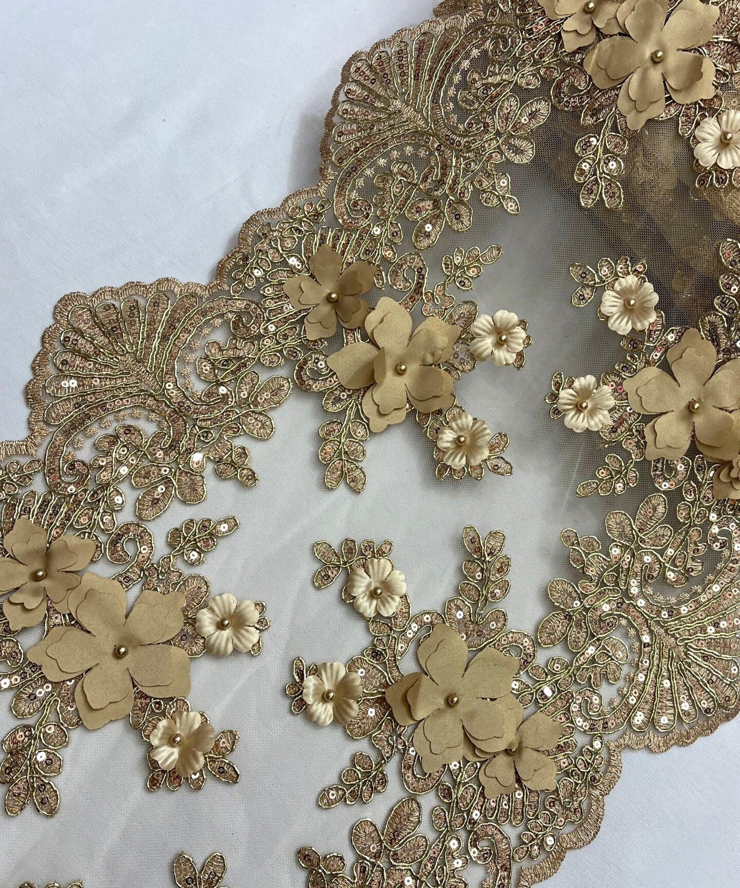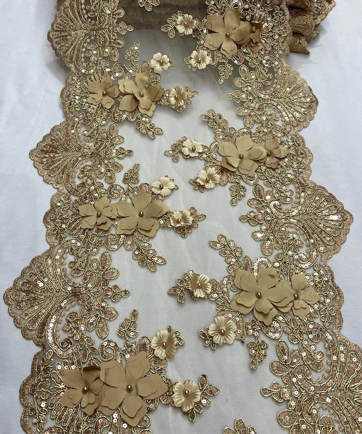 Gold 3D Wide Floral Sequin & Mesh Lace Trim for Table Runner 13"
