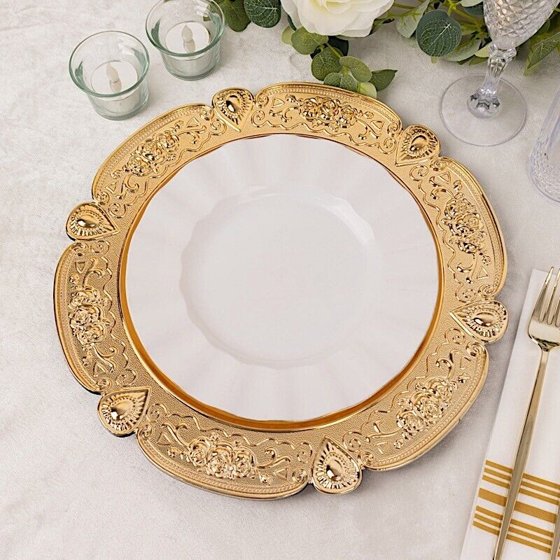 GOLD 6 Round 13" Floral Embossed Plastic CHARGER PLATES