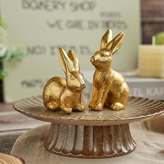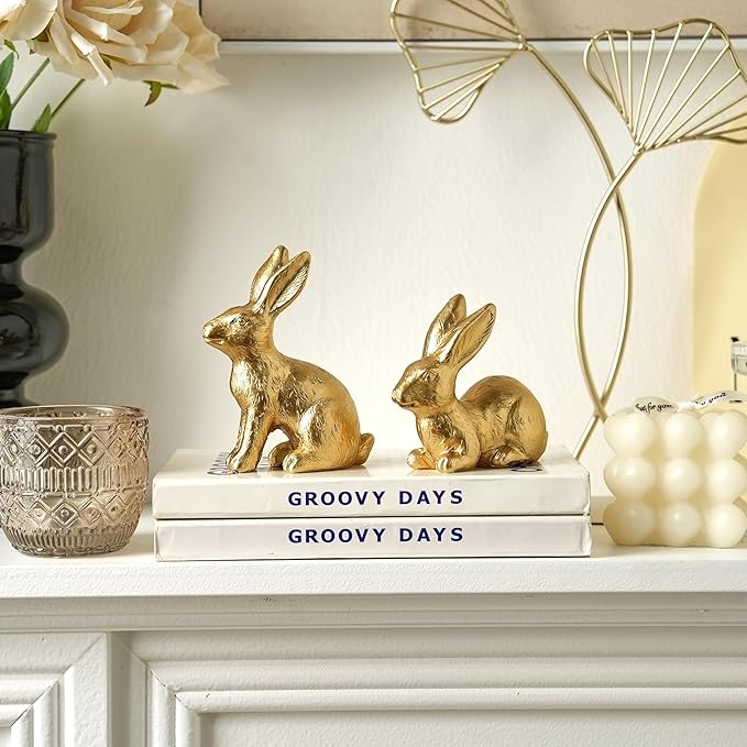 Gold Easter Bunny Decor, Small Bunny Figurines Set of 2, Resin Rabbit Statues, Gold Bunny Easter Tabletop Decor for Spring Centerpiece, Home Mantle Shelf Decor