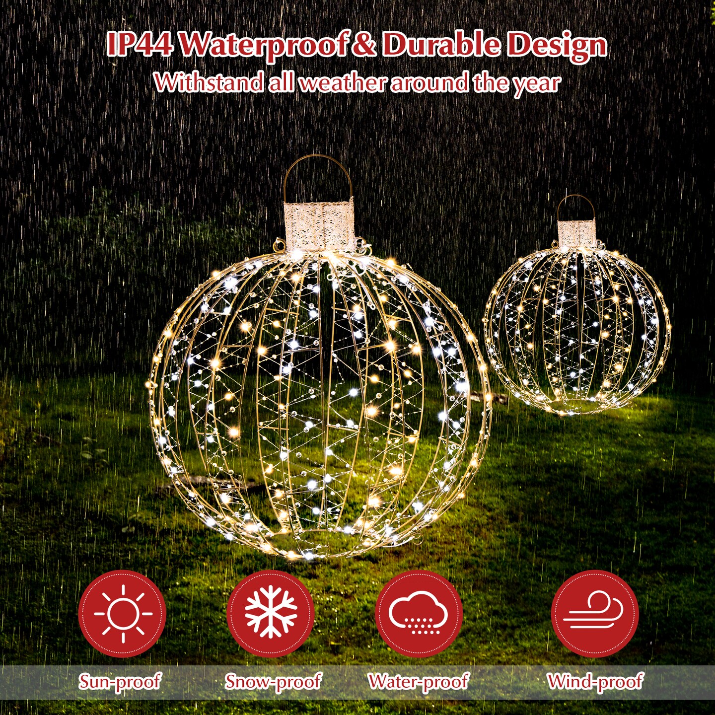 Gold Iron Christmas Light Spheres with 360 LED Beads, Hooks, Rings and Stakes