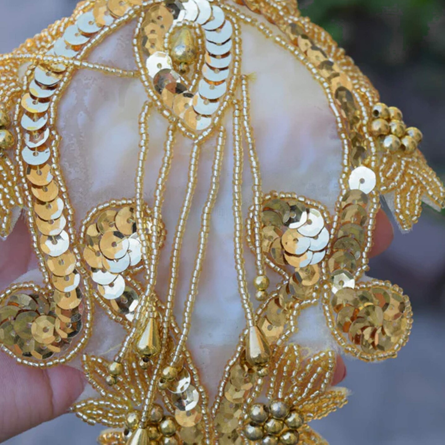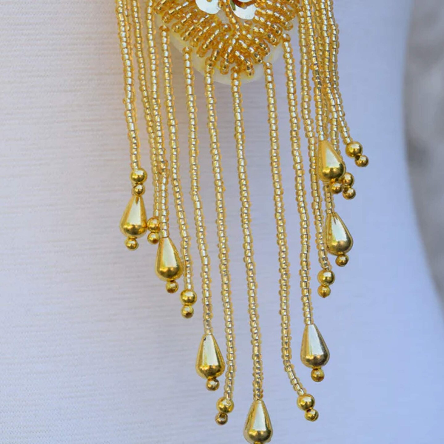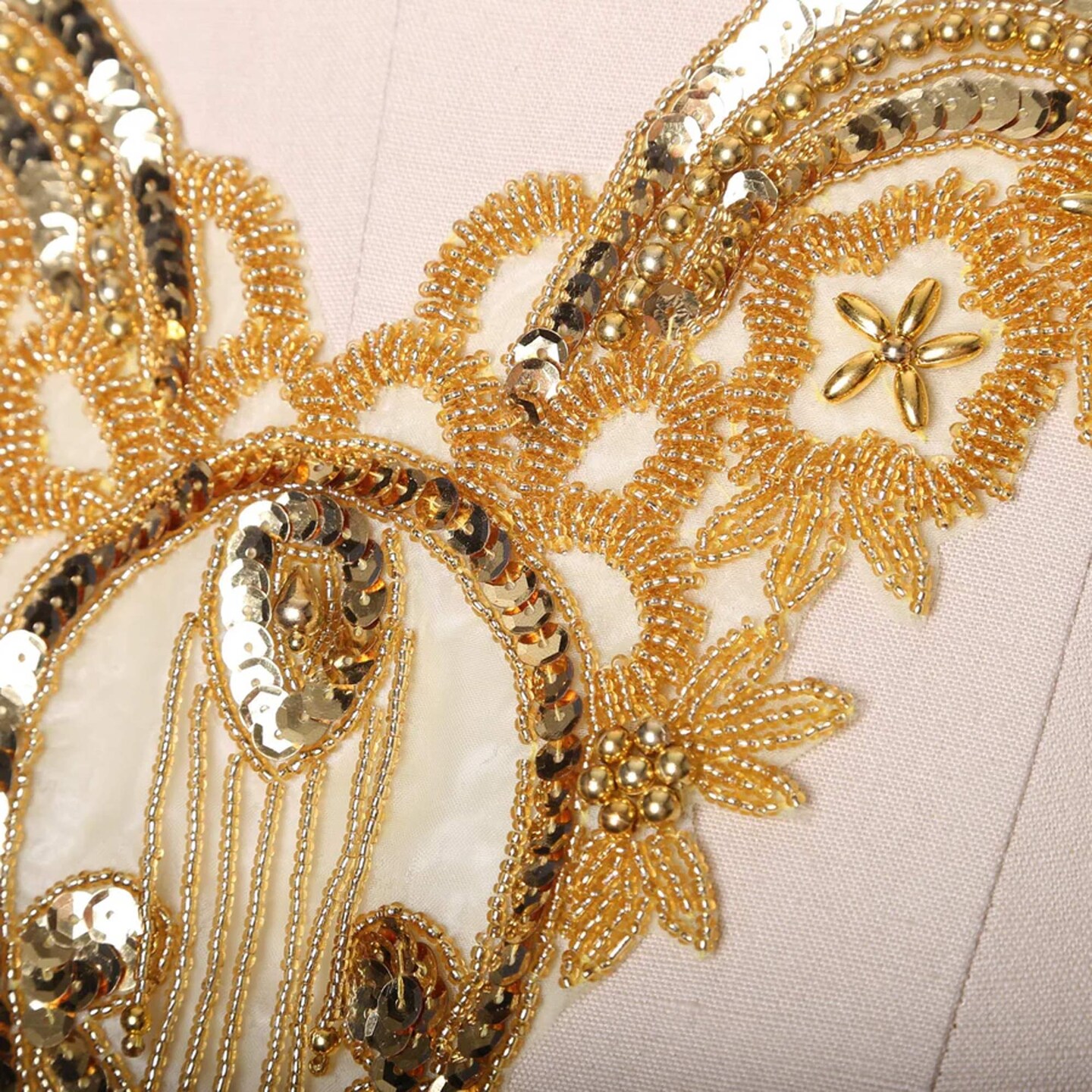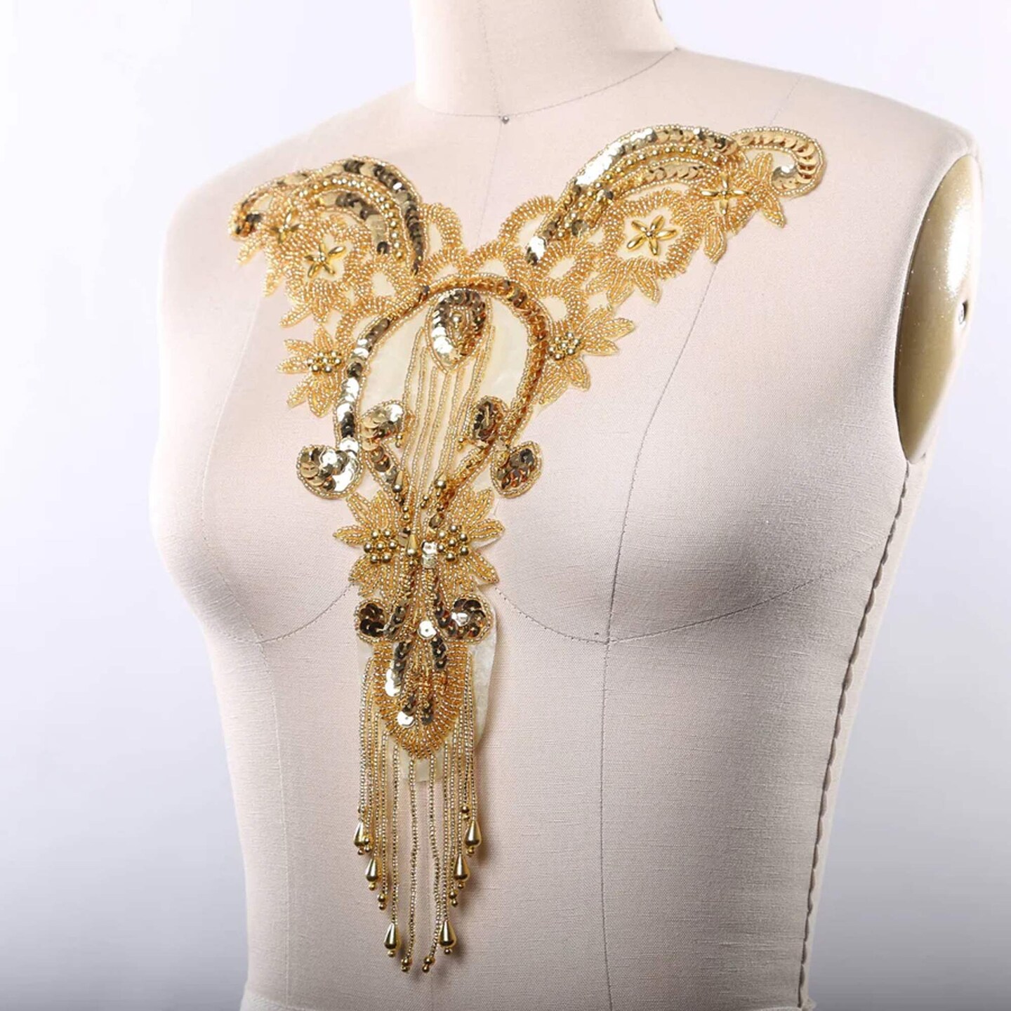 Gold Oversized Beaded Neckline Applique with Fringe for Costumes and Dresses Hot Fix Patch