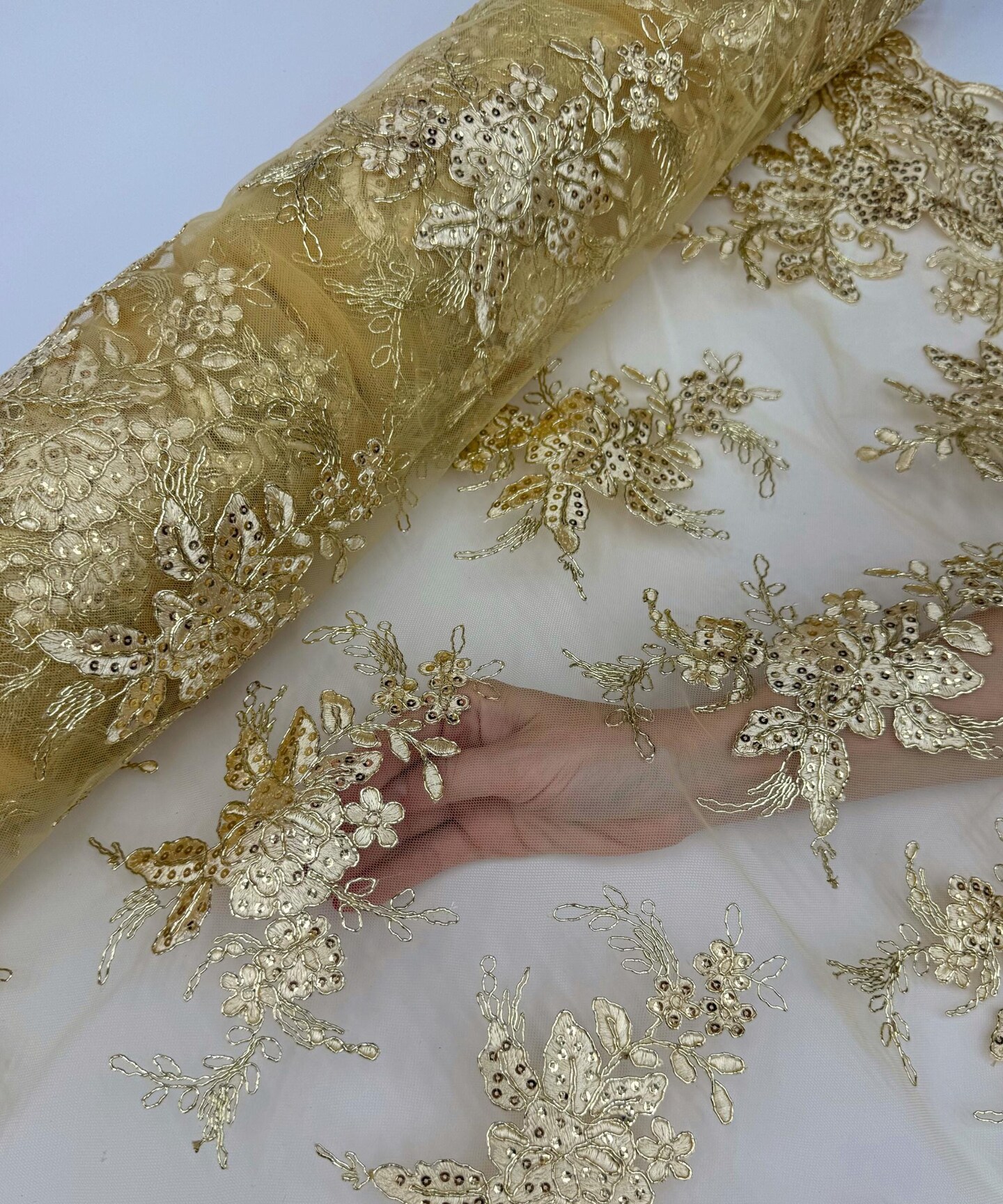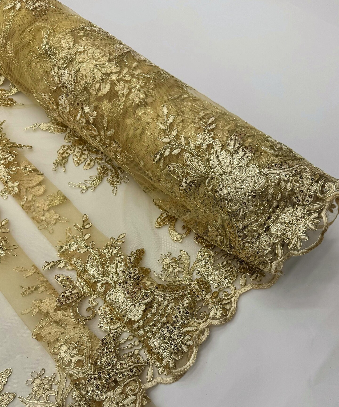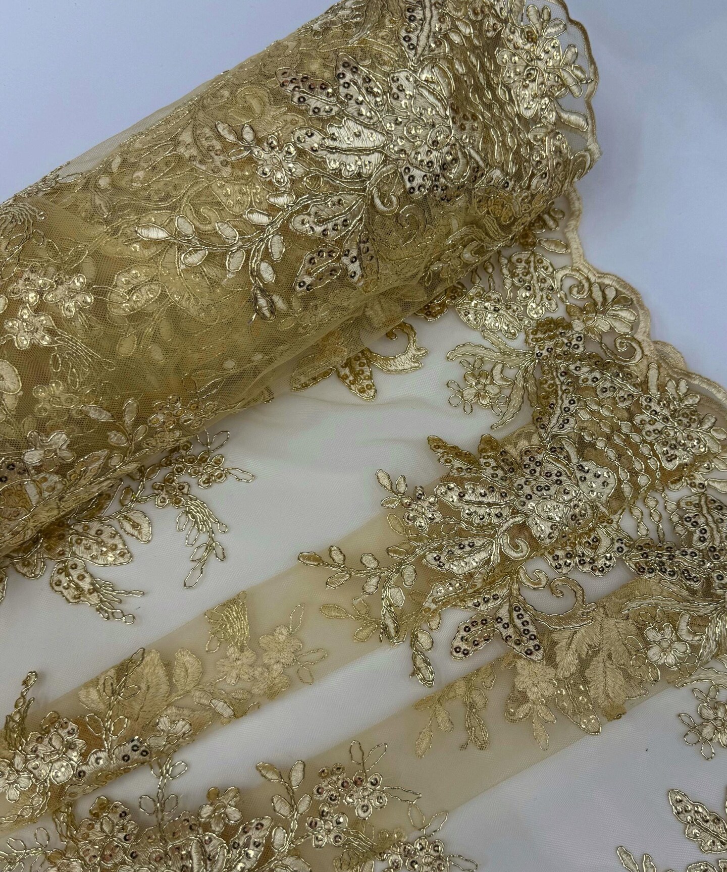 Gold Sequin Embroidered Lace Fabric by the Yard, 54" Wide Floral Mesh Lace with Double Scalloped Edges