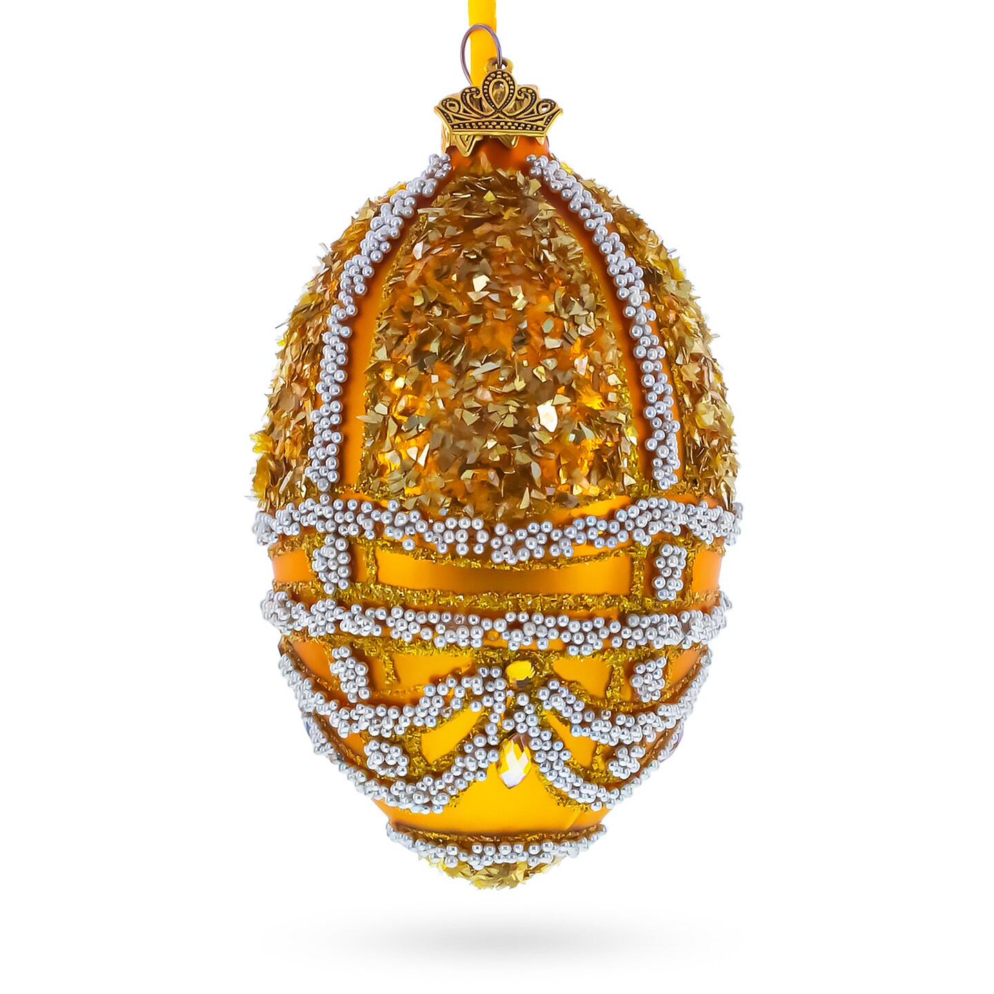 Gold Shard and Pearl Bead Embellished Glass Egg Ornament 4 Inches