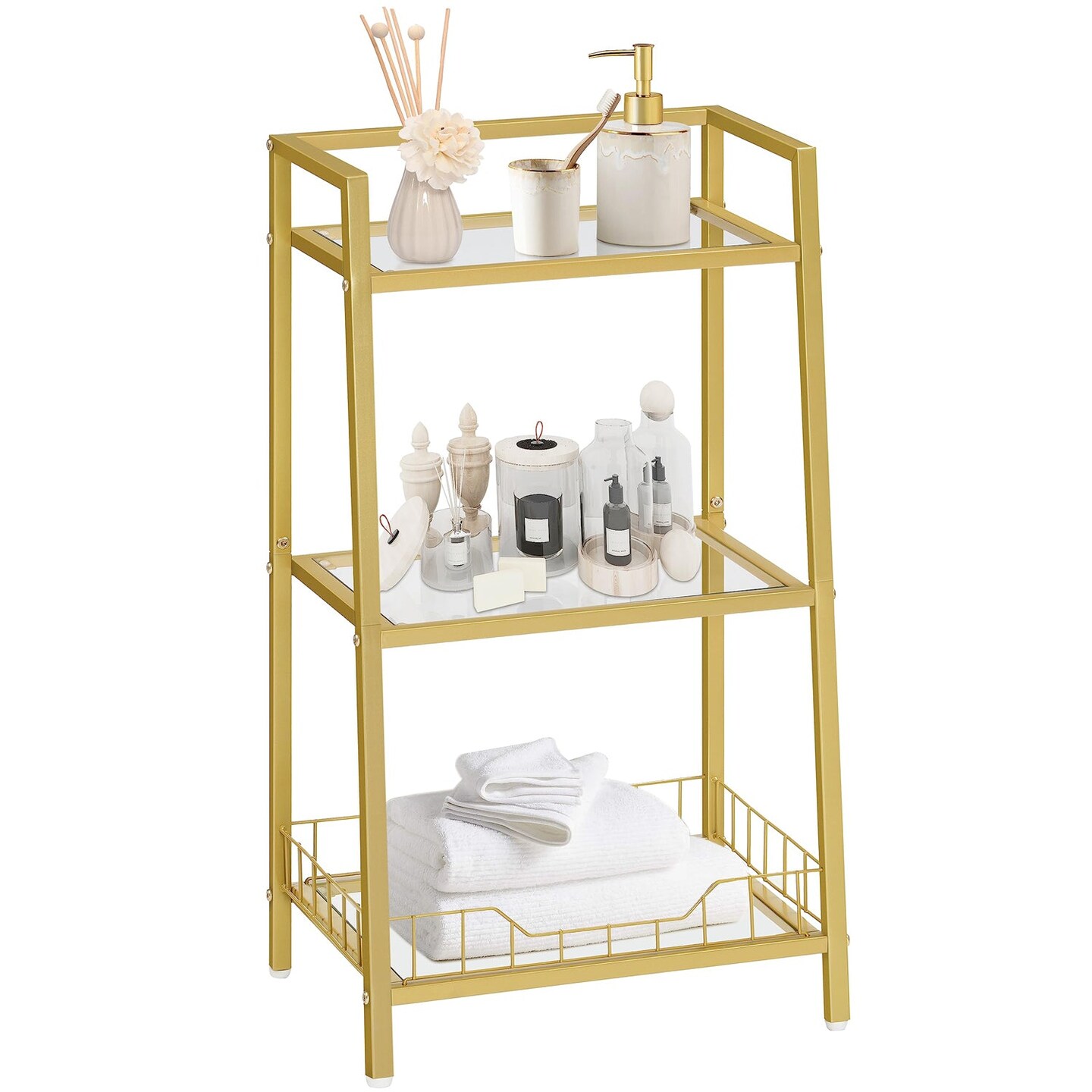 Gold Tempered Glass Bathroom Shelf with 3 Tiers and Guardrails