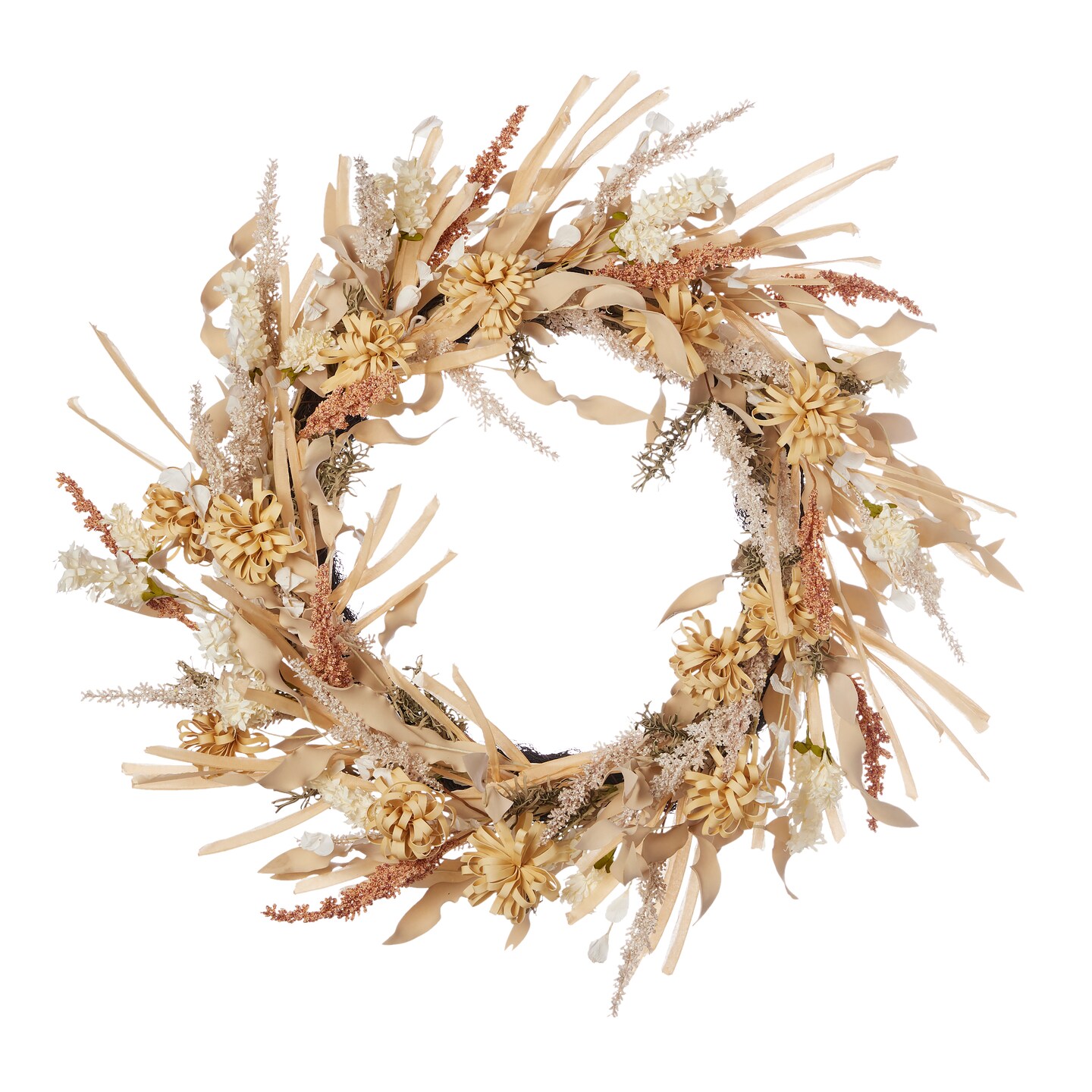 Golden Wild Flower 26in Wreath, w/ Artificial Flax Grass, Mini Mums, Wild Delphinum, & Millet
