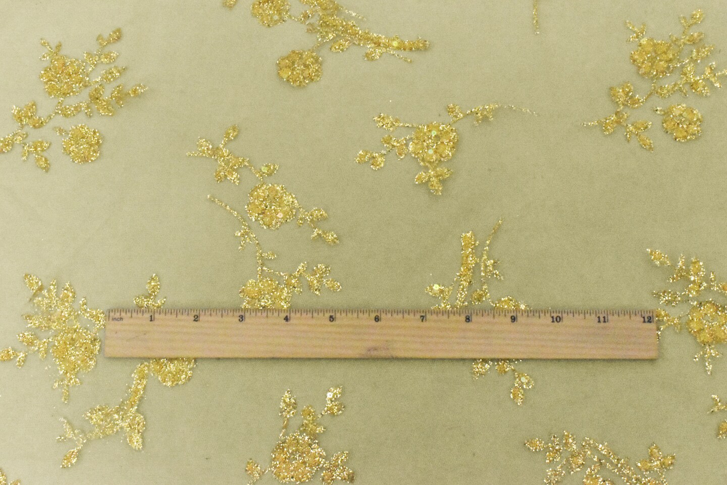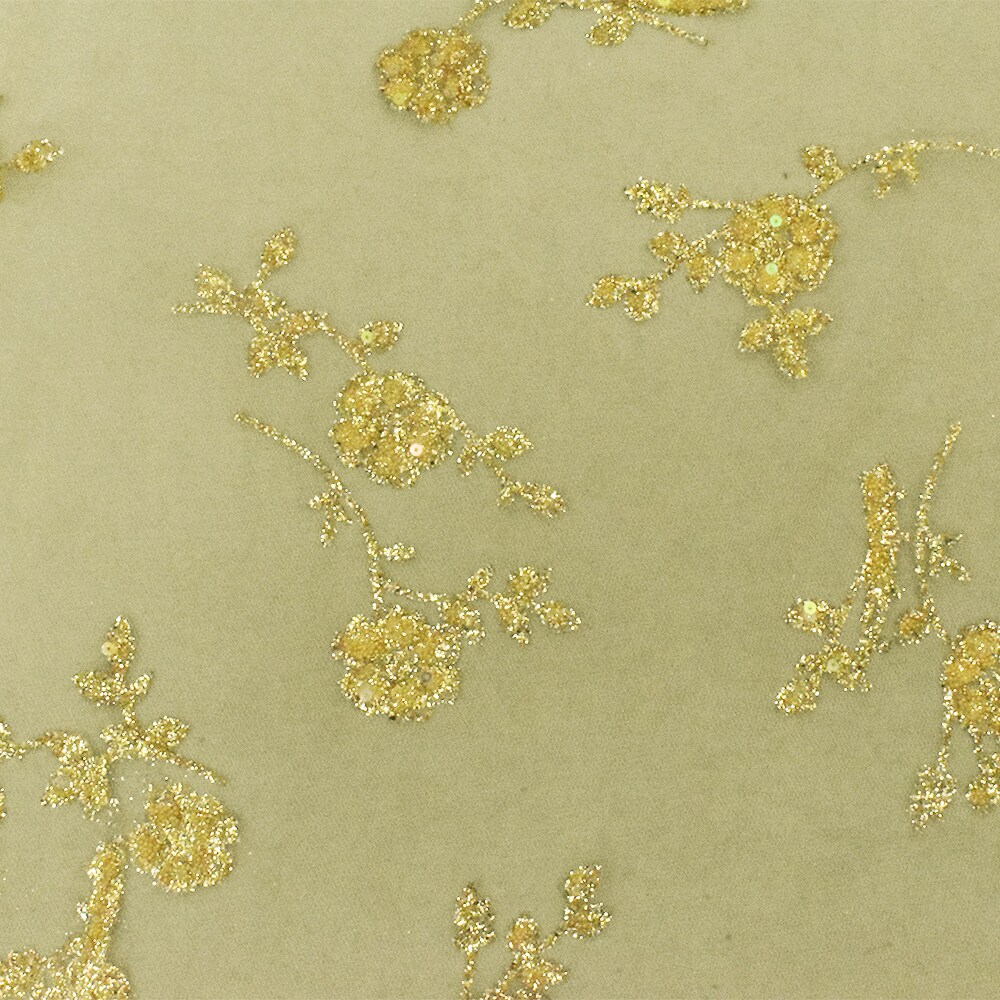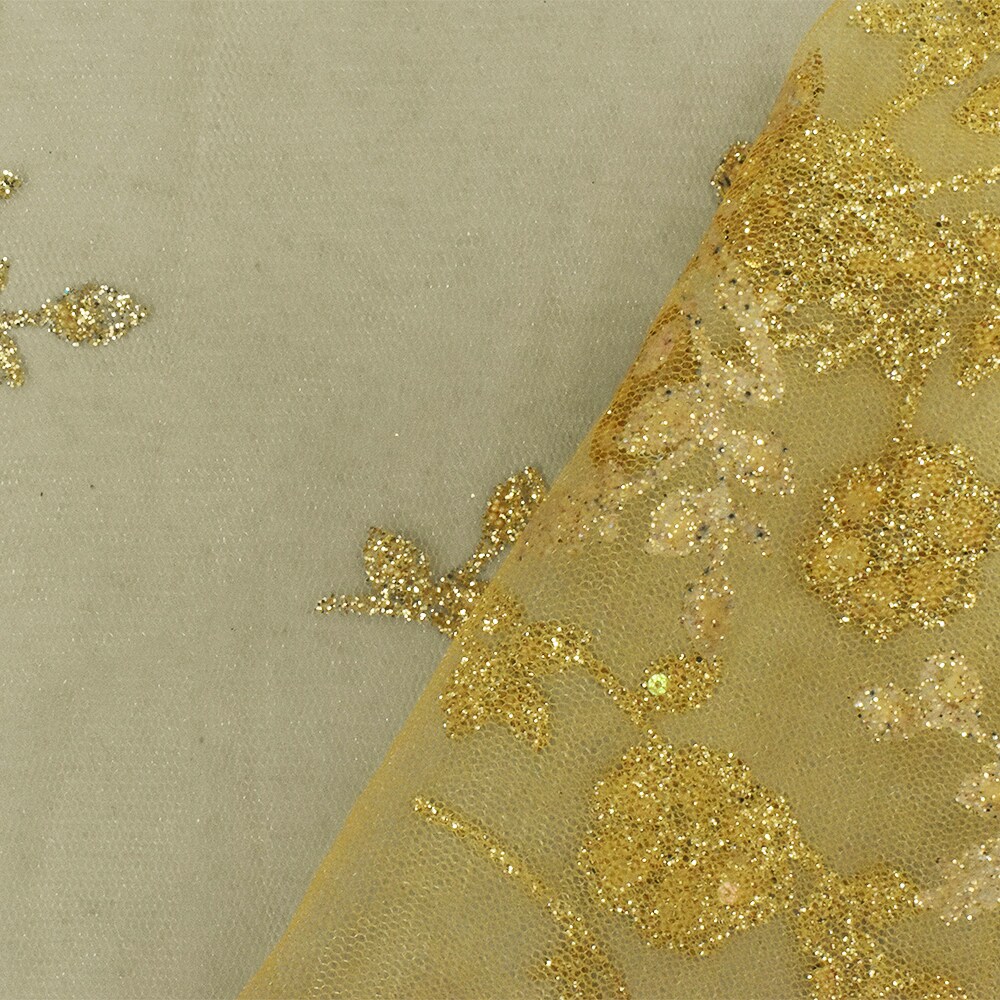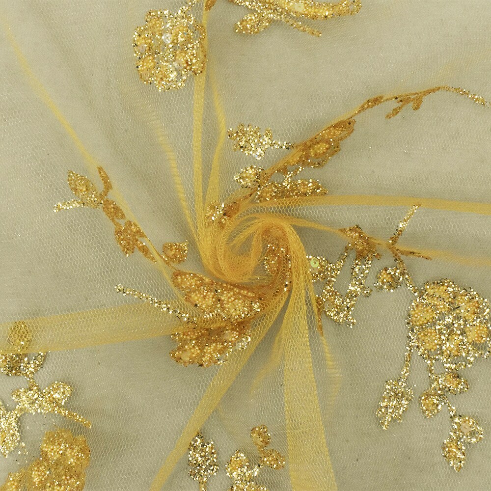 Golden Yellow Floral Sparkles and Bead Poly Mesh Knit Fabric By the Yard