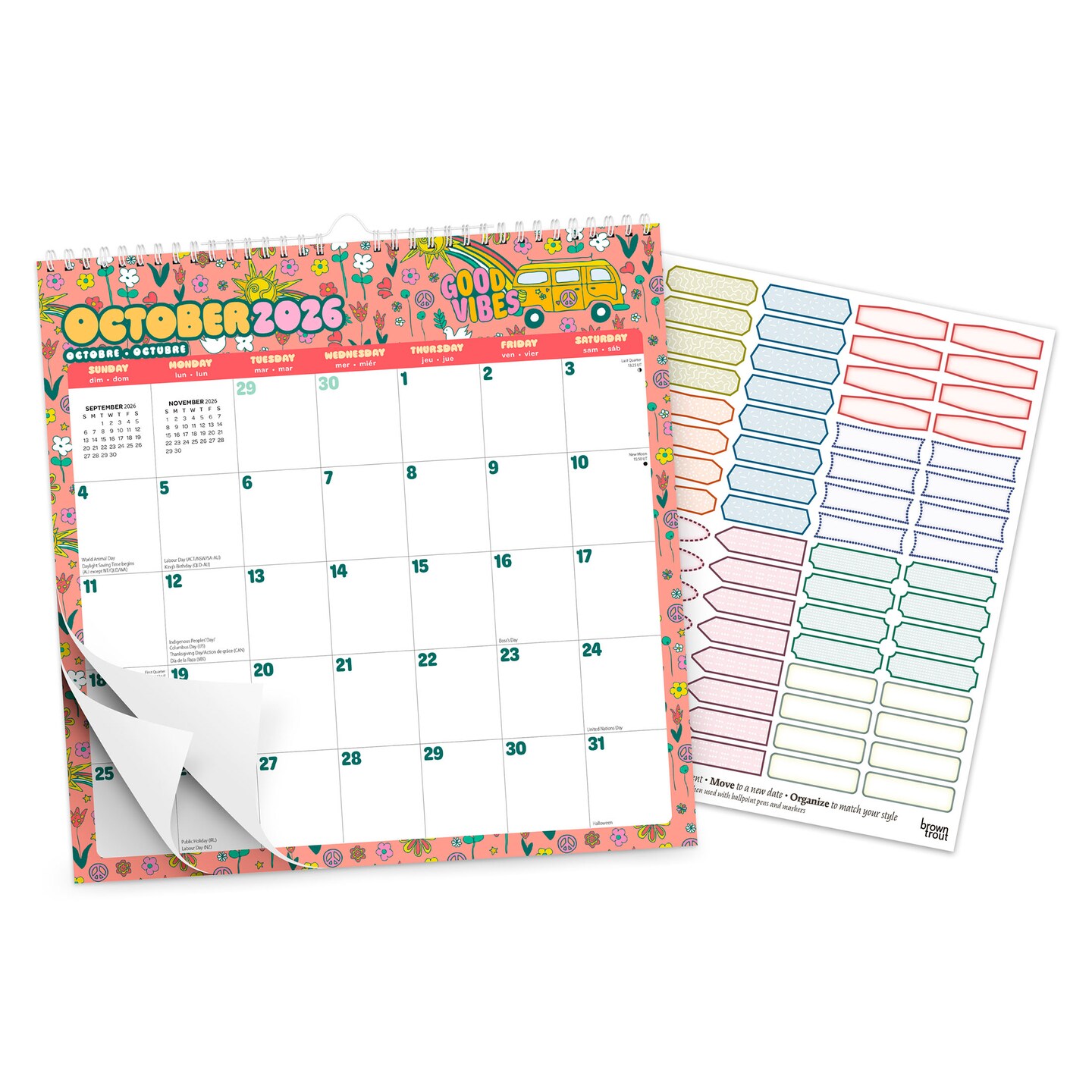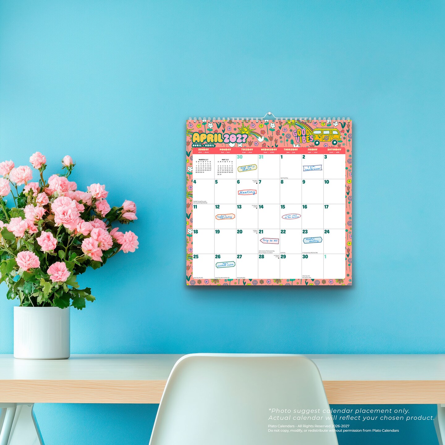 Good Vibes | 2027 12 x 12 Inch (Hanging) 18 Months Monthly Square Wire-O Calendar | Sticker Sheet | July 2026 - December 2027 | Plato | Planning Stationery