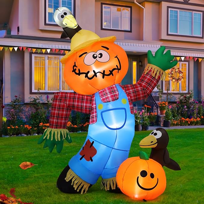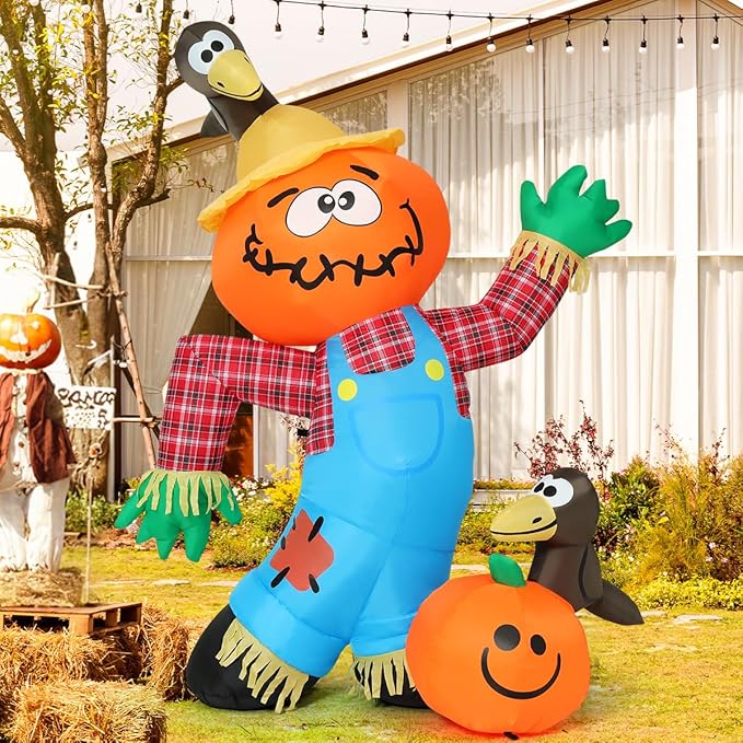 GOOSH 6 FT Thanksgiving Inflatable Decorations Crow Fall Harvest Pumpkin Scarecrow with Built-in LED Lights