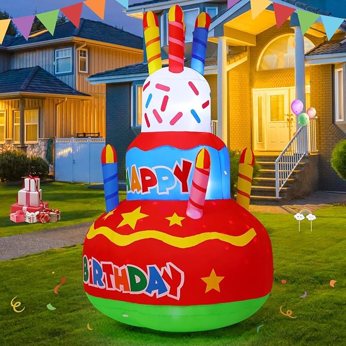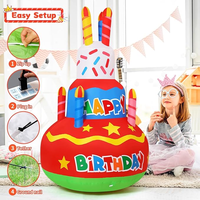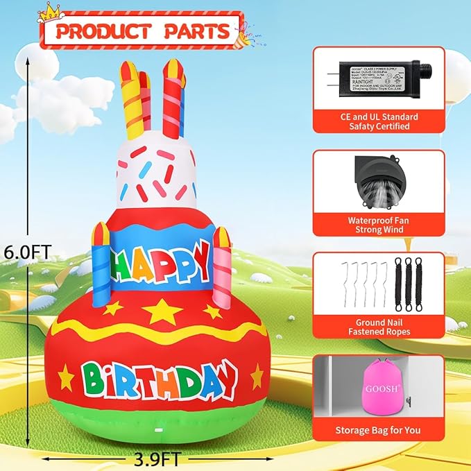 GOOSH 6.2 FT Birthday Inflatables Cake with Candle, Happy Birthday Decoration with Colorful Rotating LED Lights