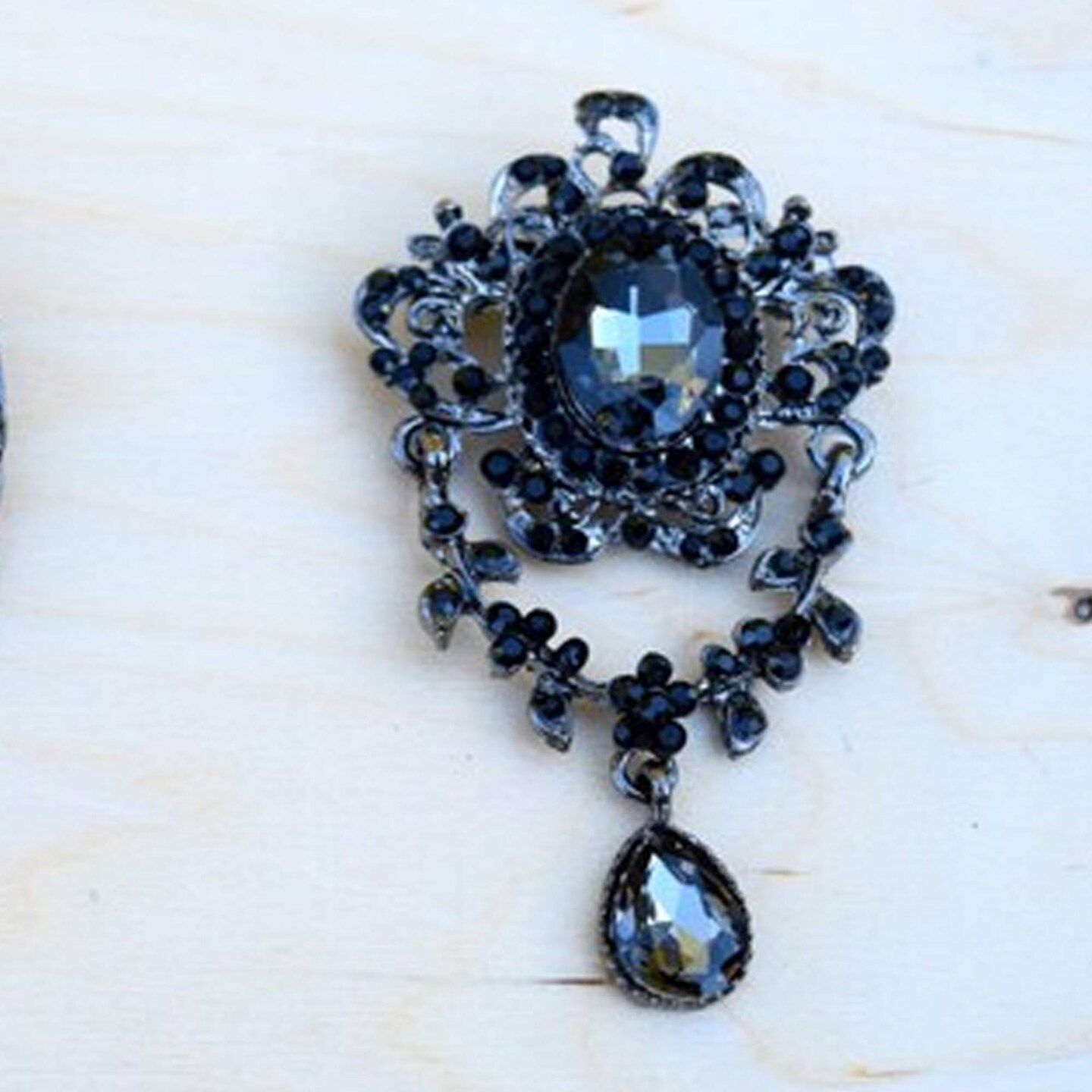 Gothic Gunmetal Brooch with Pendant and Dark Acrylic Stones for Antique Fashion Jewelry
