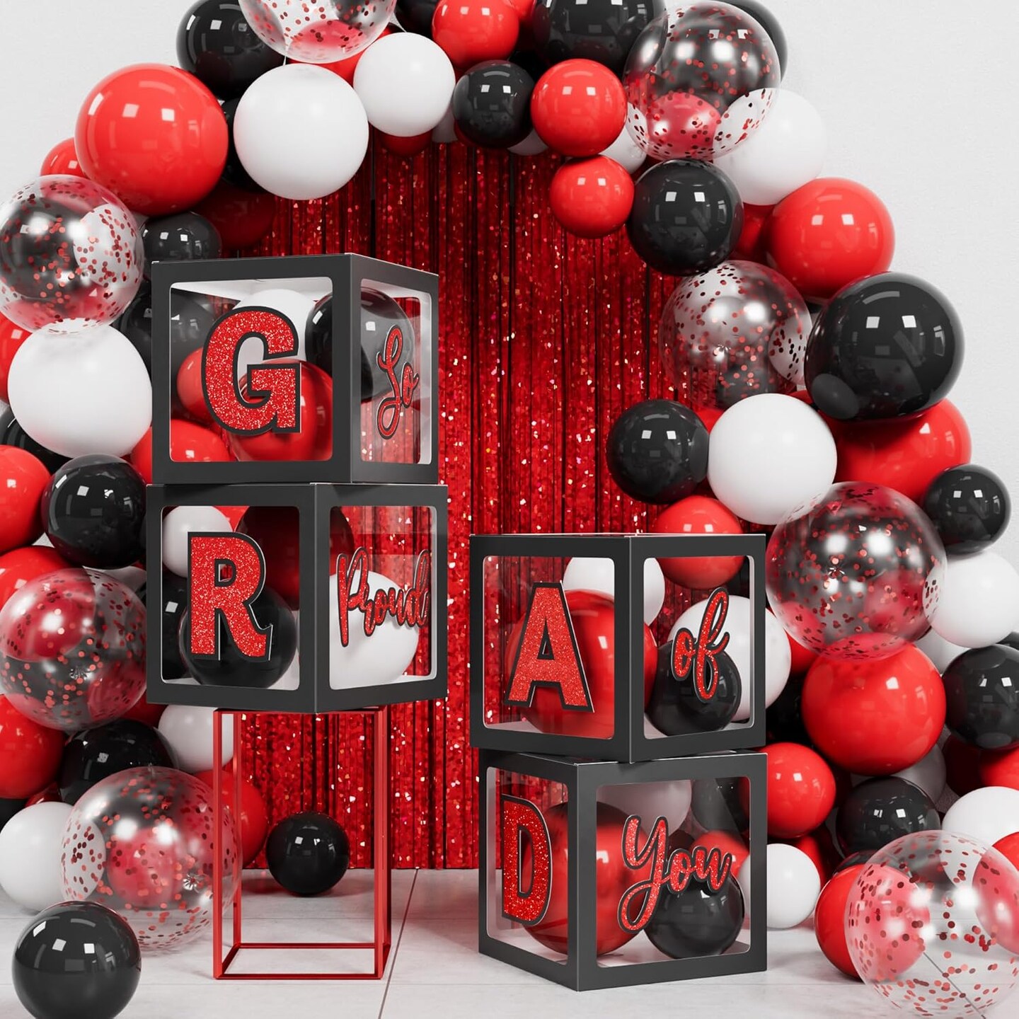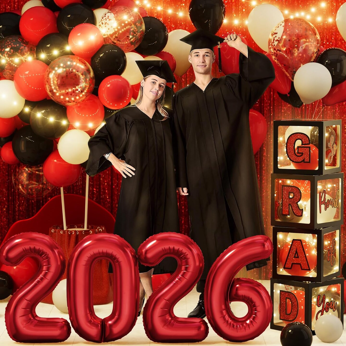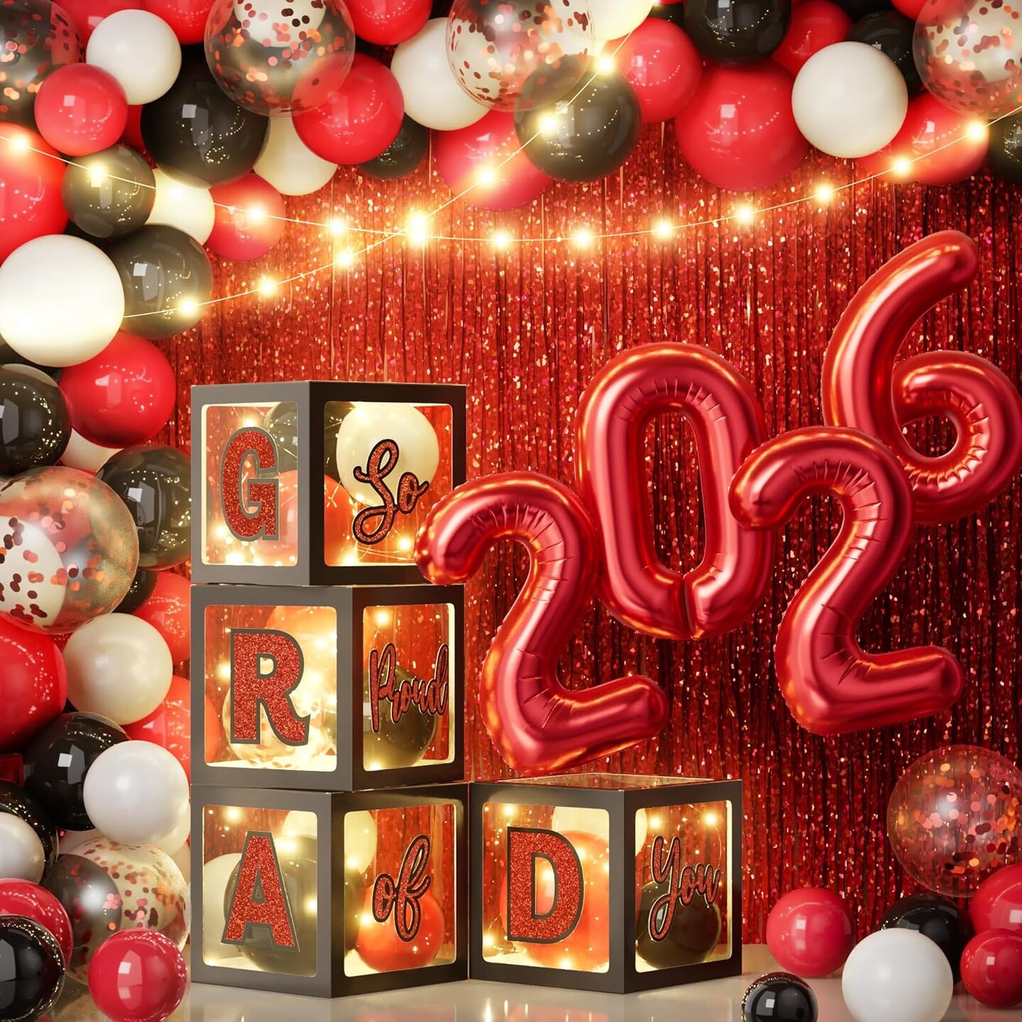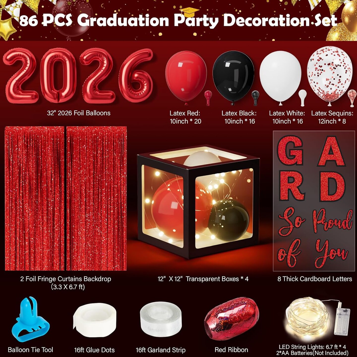 Graduation Party Decorations Class of 2026 – 86pcs Grad Supplies Kit with LED Light Strings, Balloon Block Letters, Foil Curtains, Backdrop & 2026 Balloon Garland – Black & Red